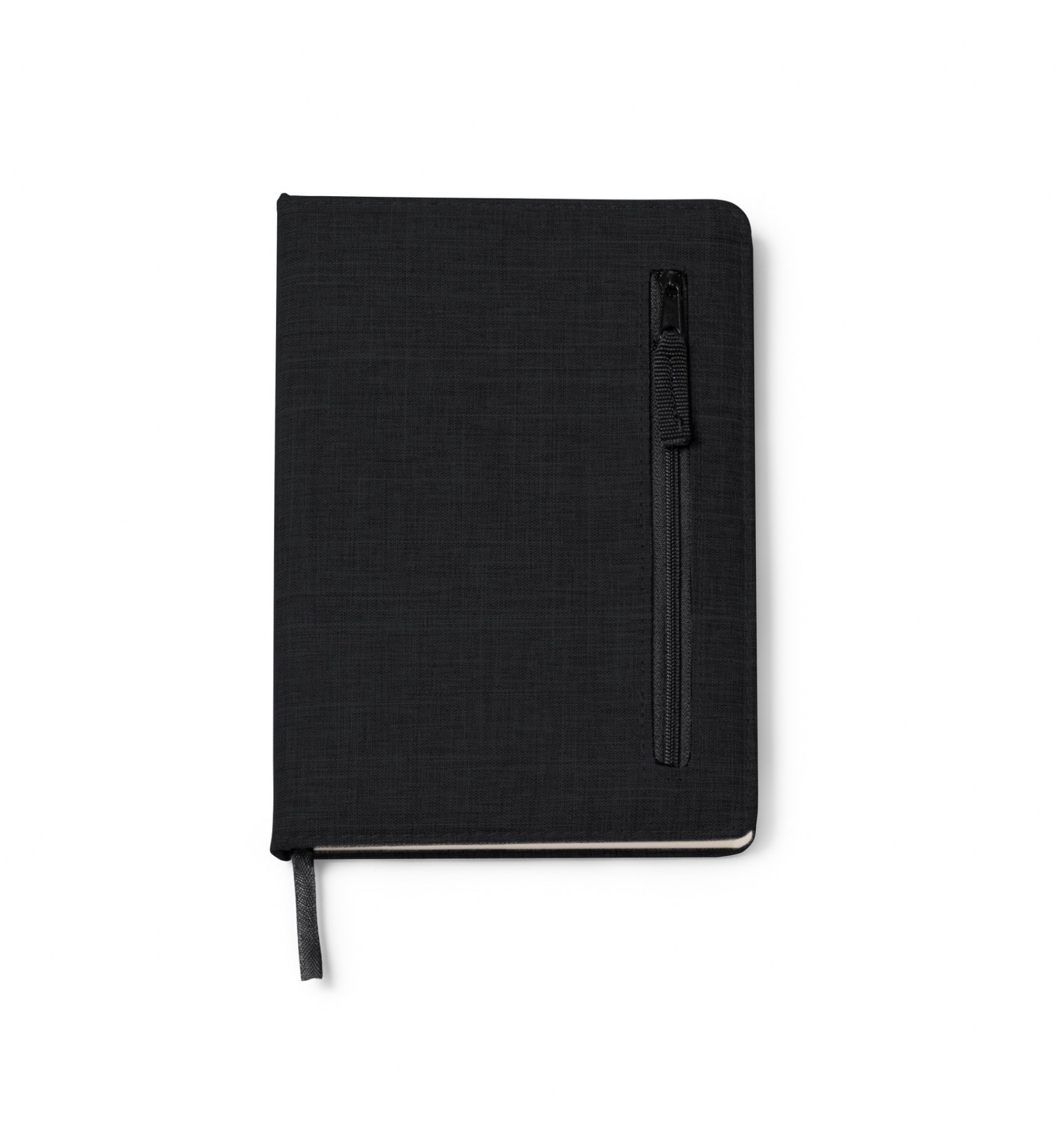 Agendă A5 fabricată din RPET. Buzunar exterior cu închidere cu fermoar.