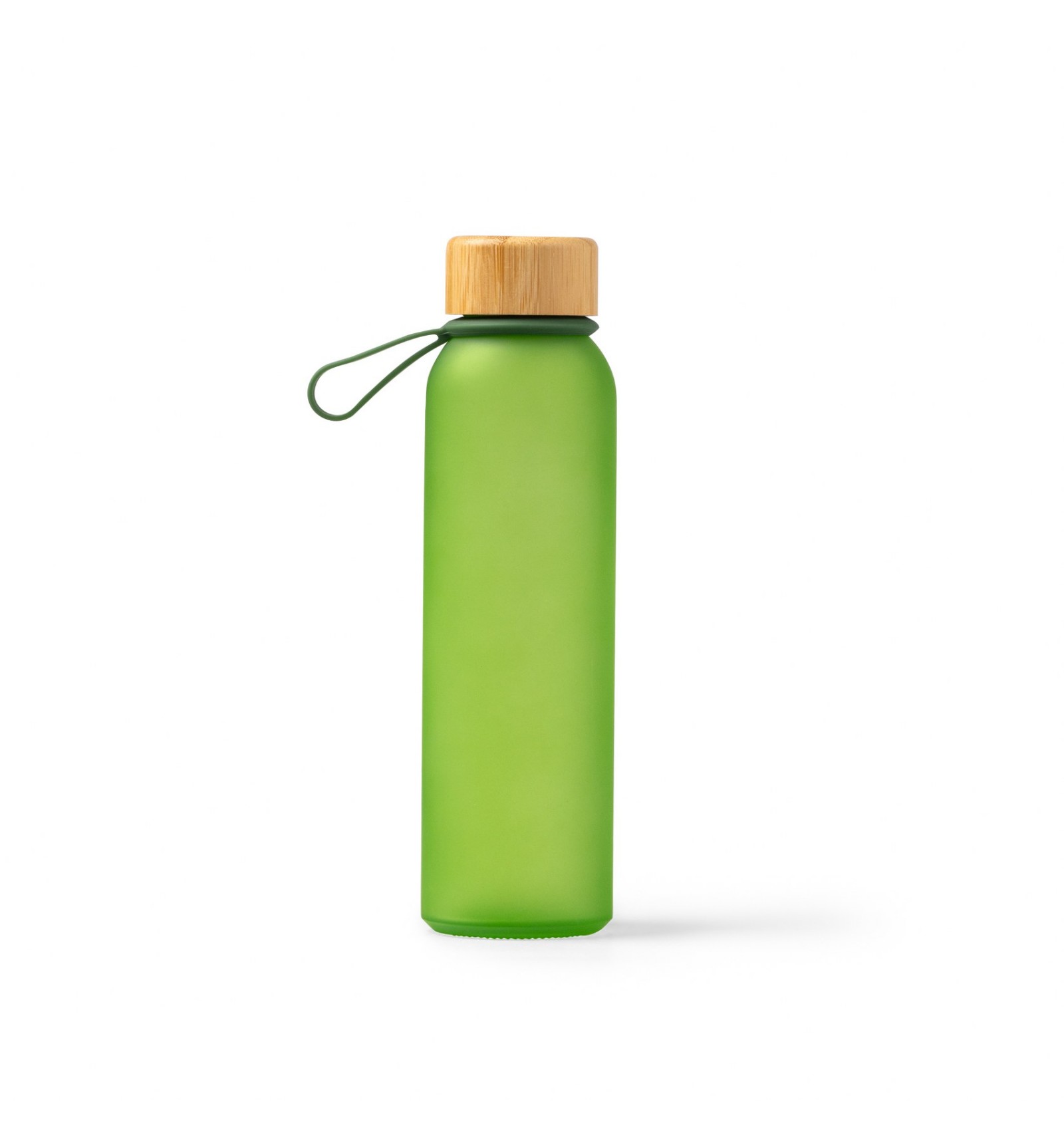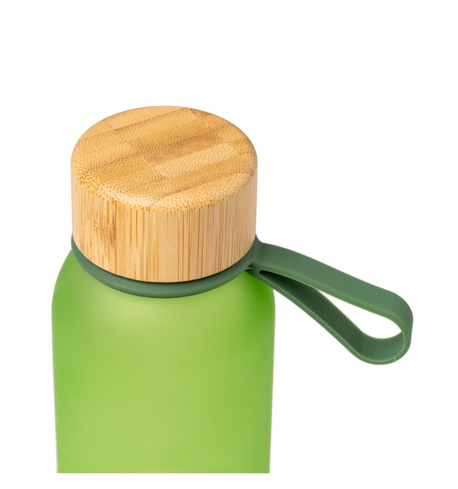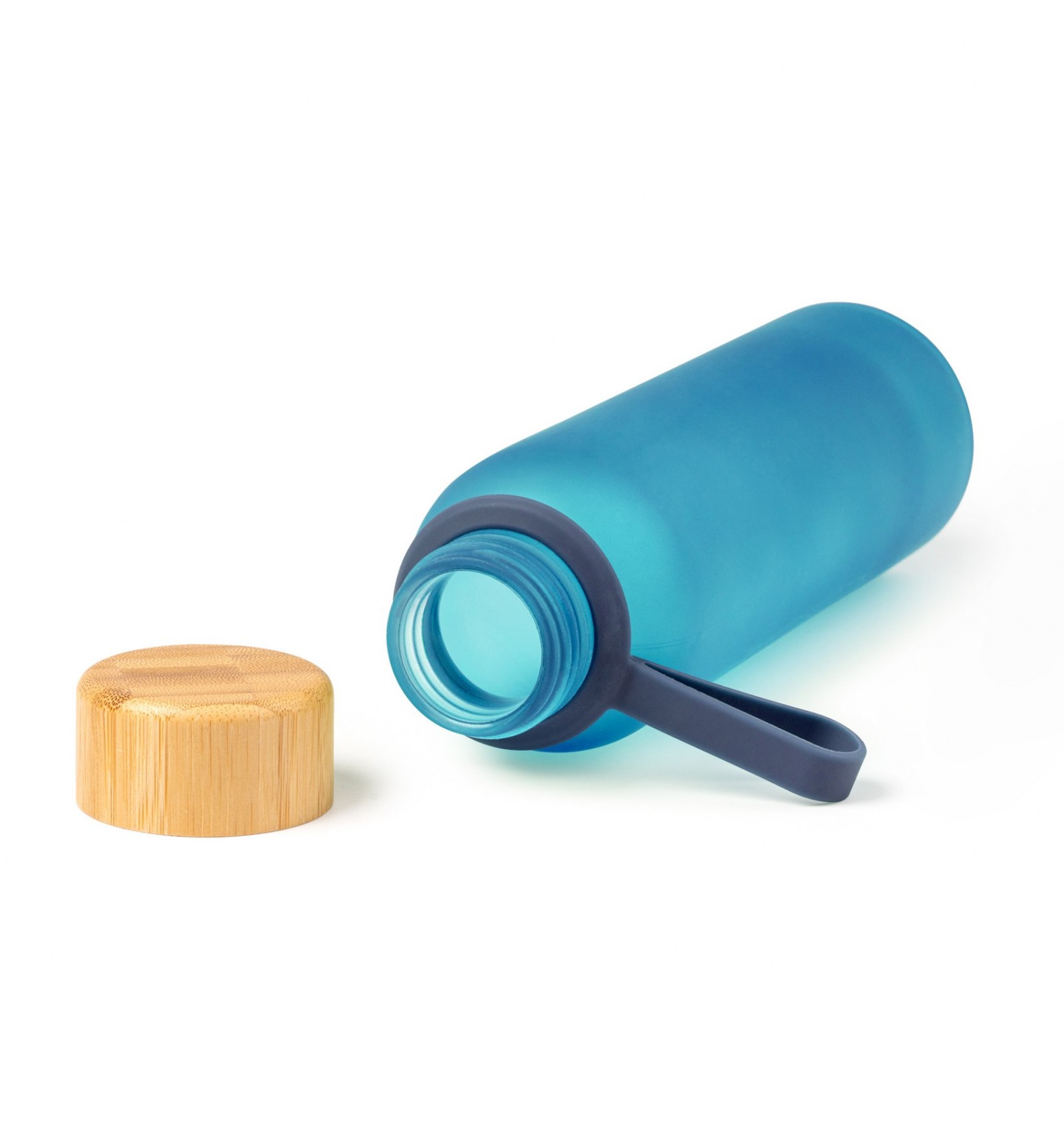 Bidon din sticlă reciclată translucidă. Are un capac cu șurub elegant din bambus și un mâner practic pentru transport.