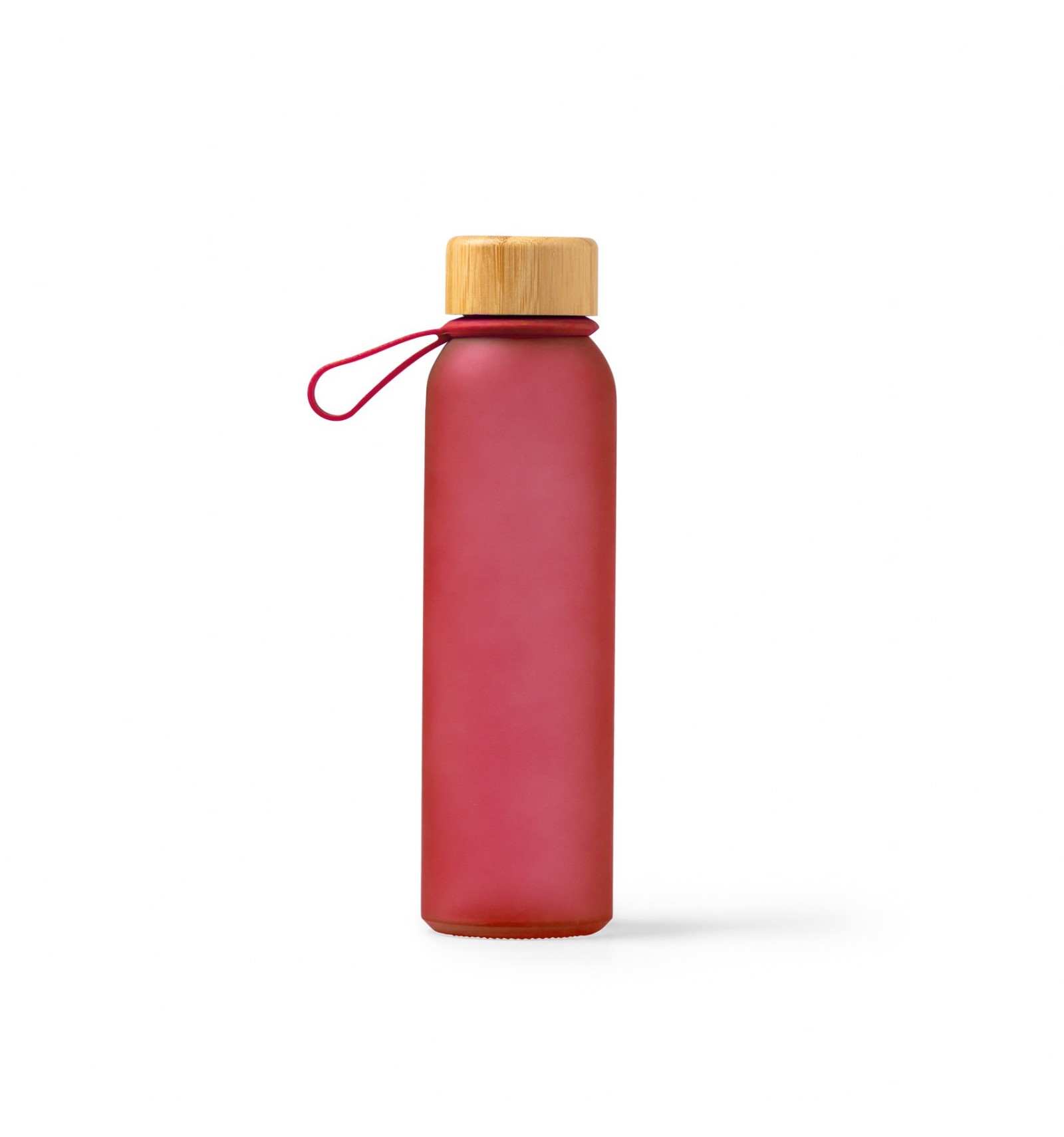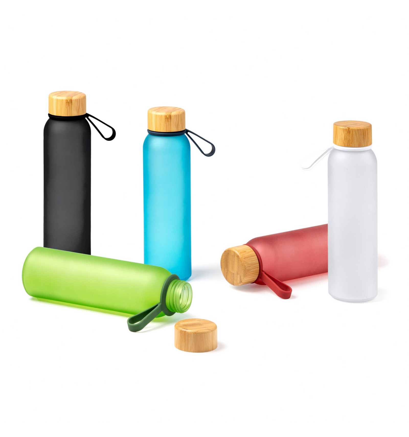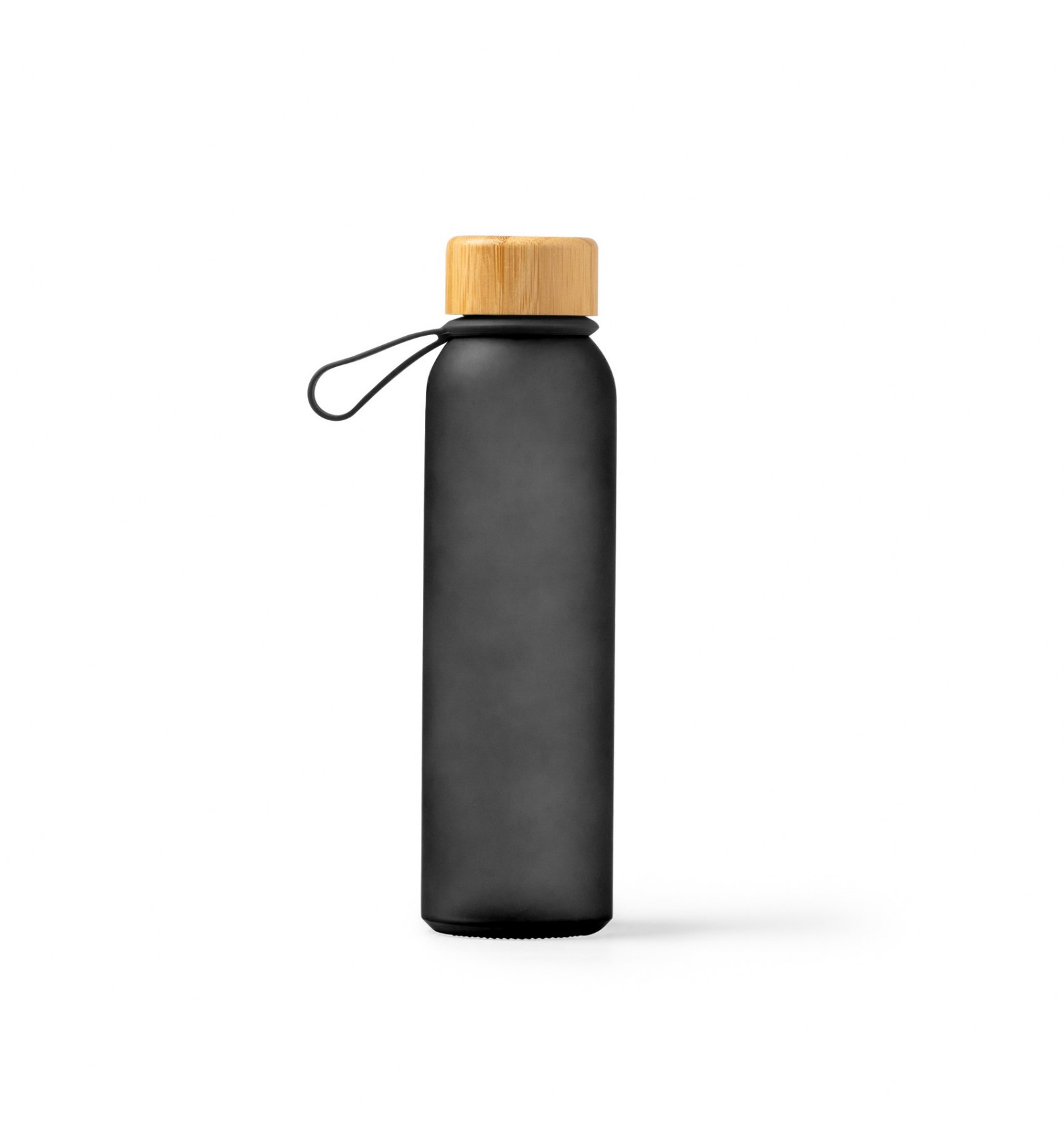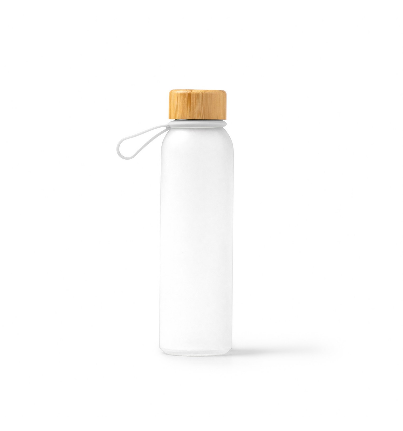 Bidon din sticlă reciclată translucidă. Are un capac cu șurub elegant din bambus și un mâner practic pentru transport.