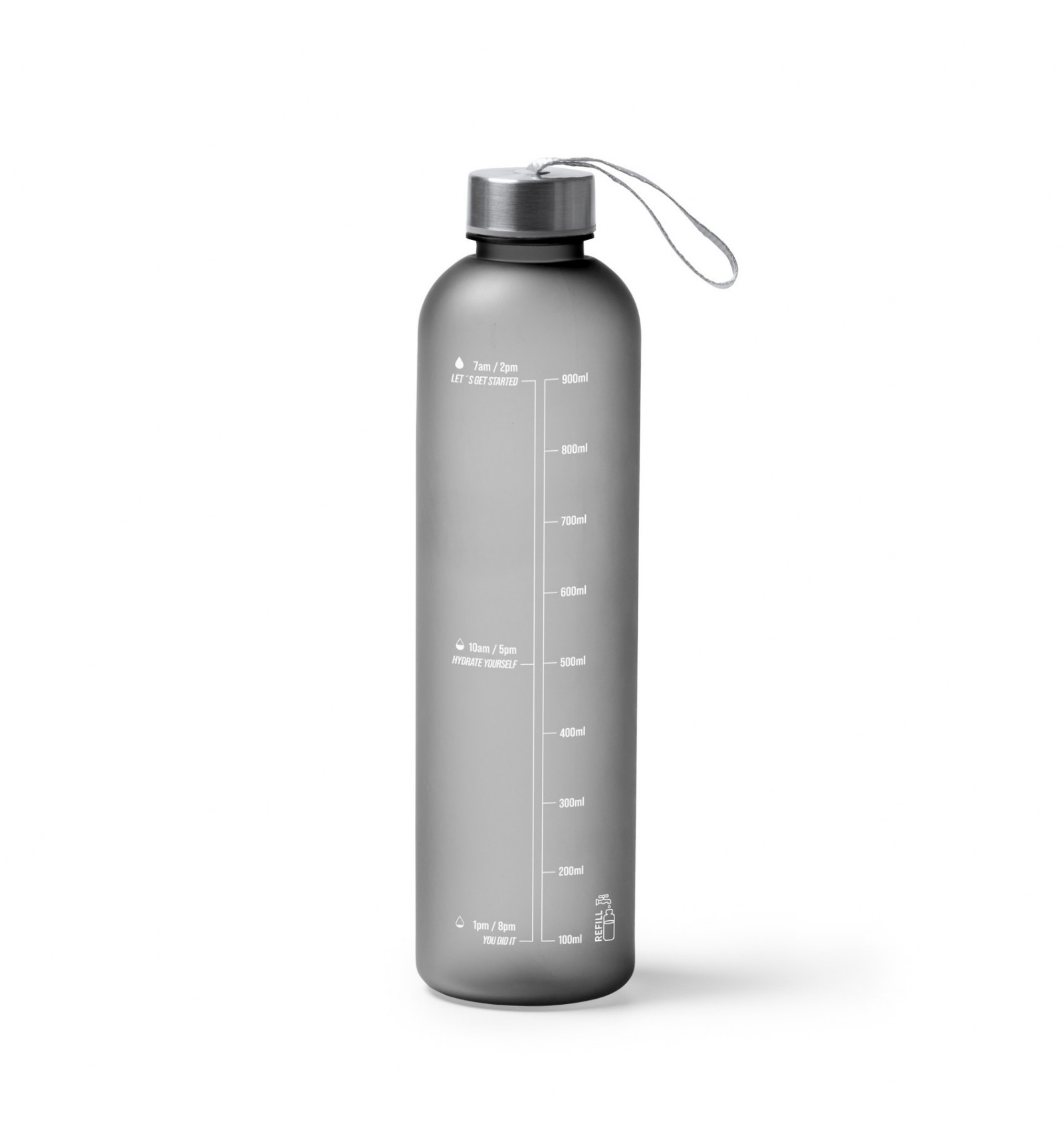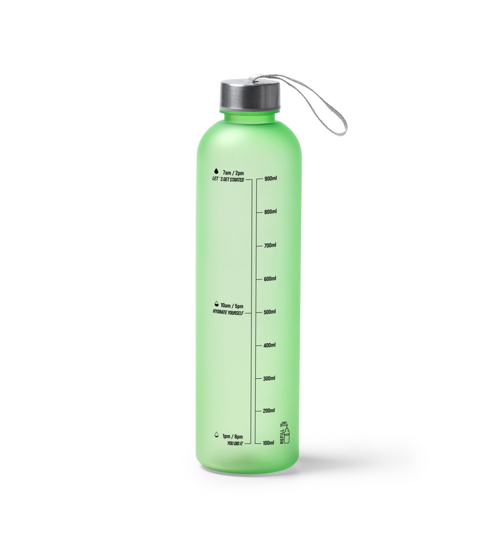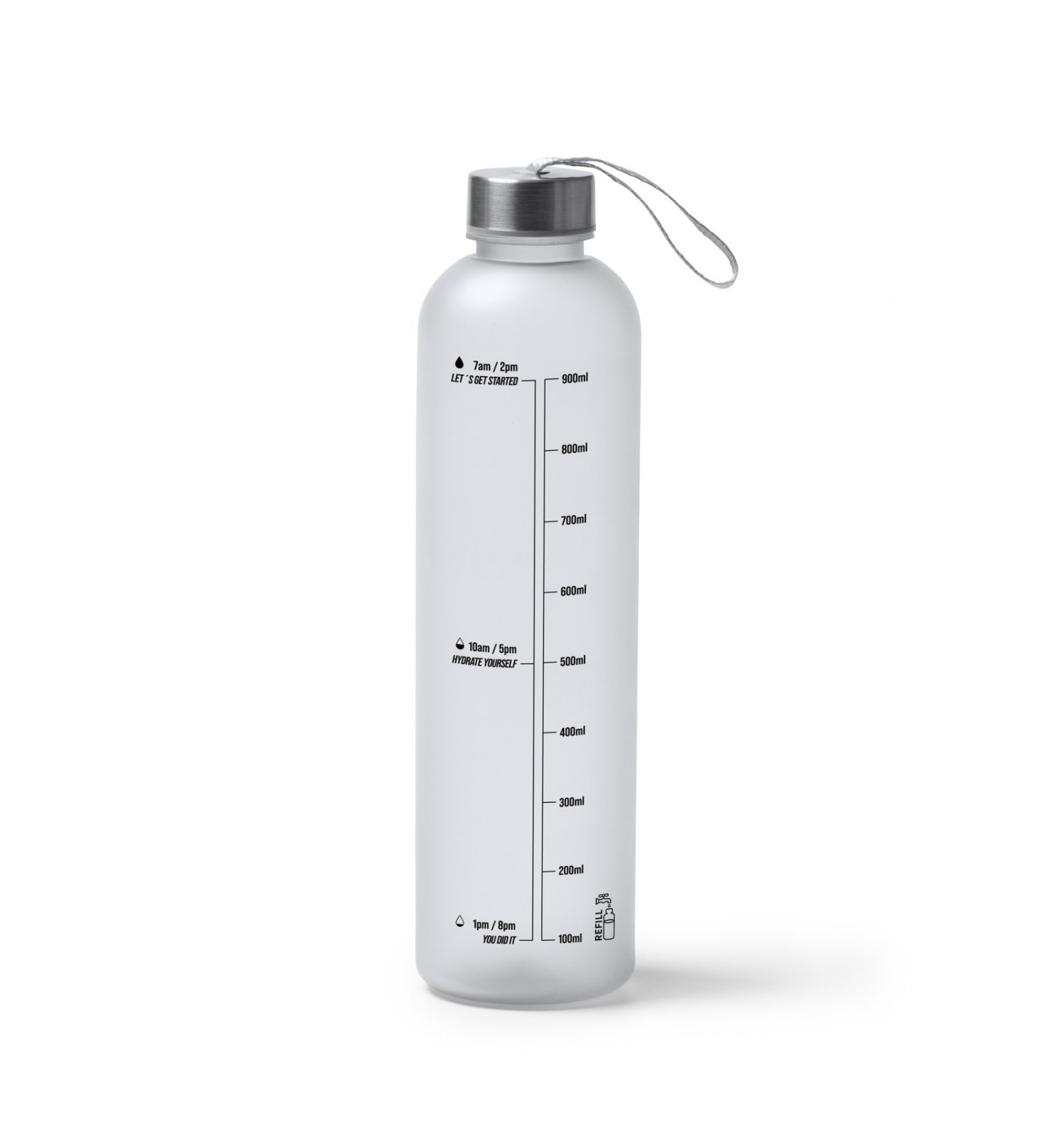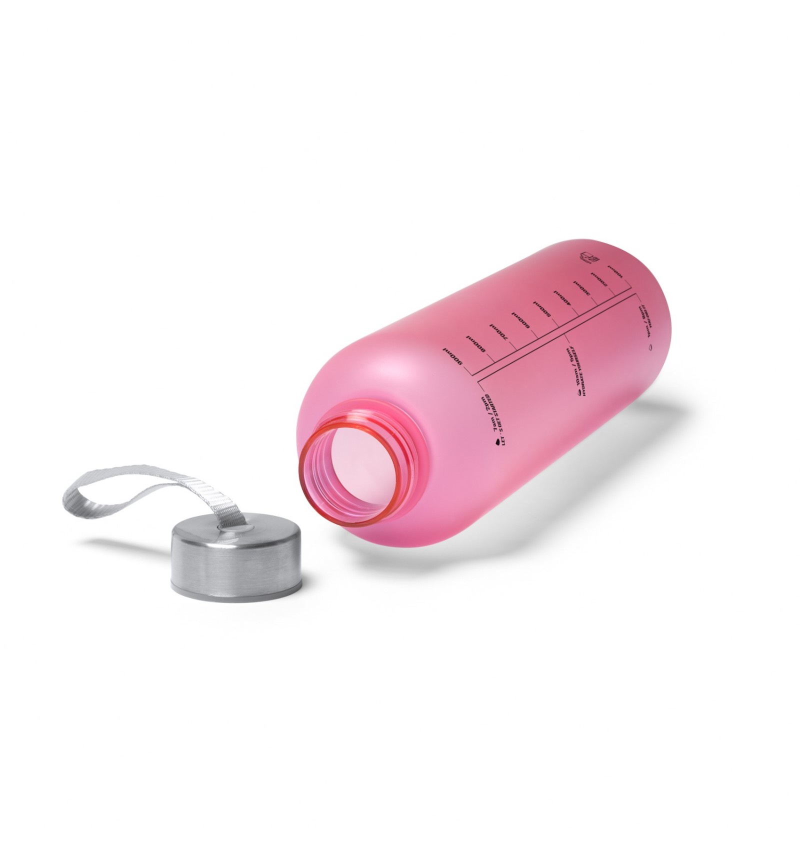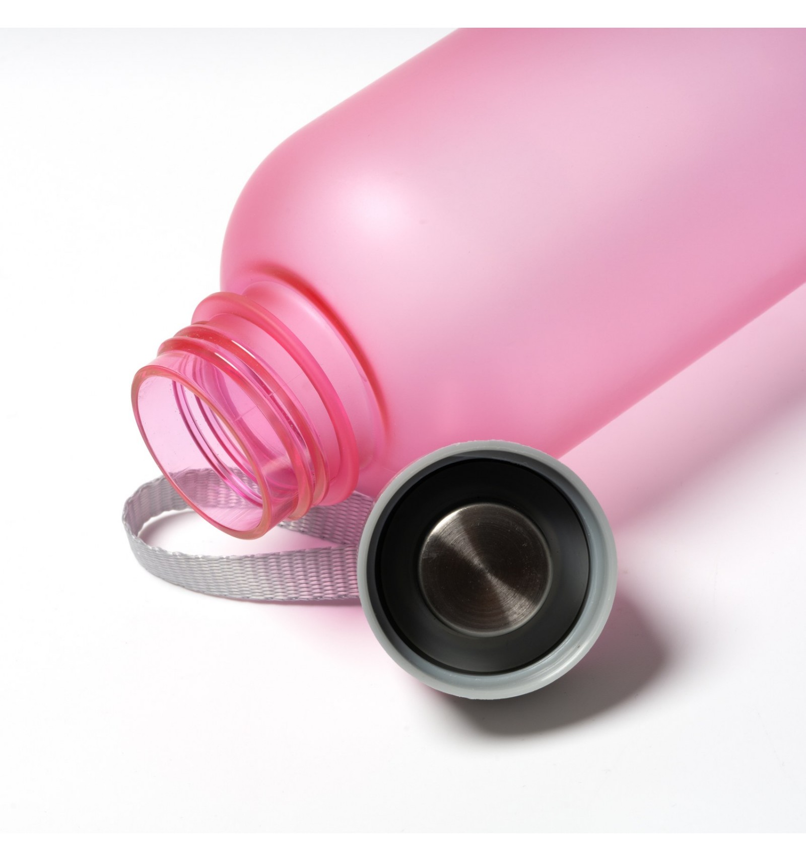 Sticlă Tritan cu corp translucid, capac cu înșurubare și mâner de transport.
