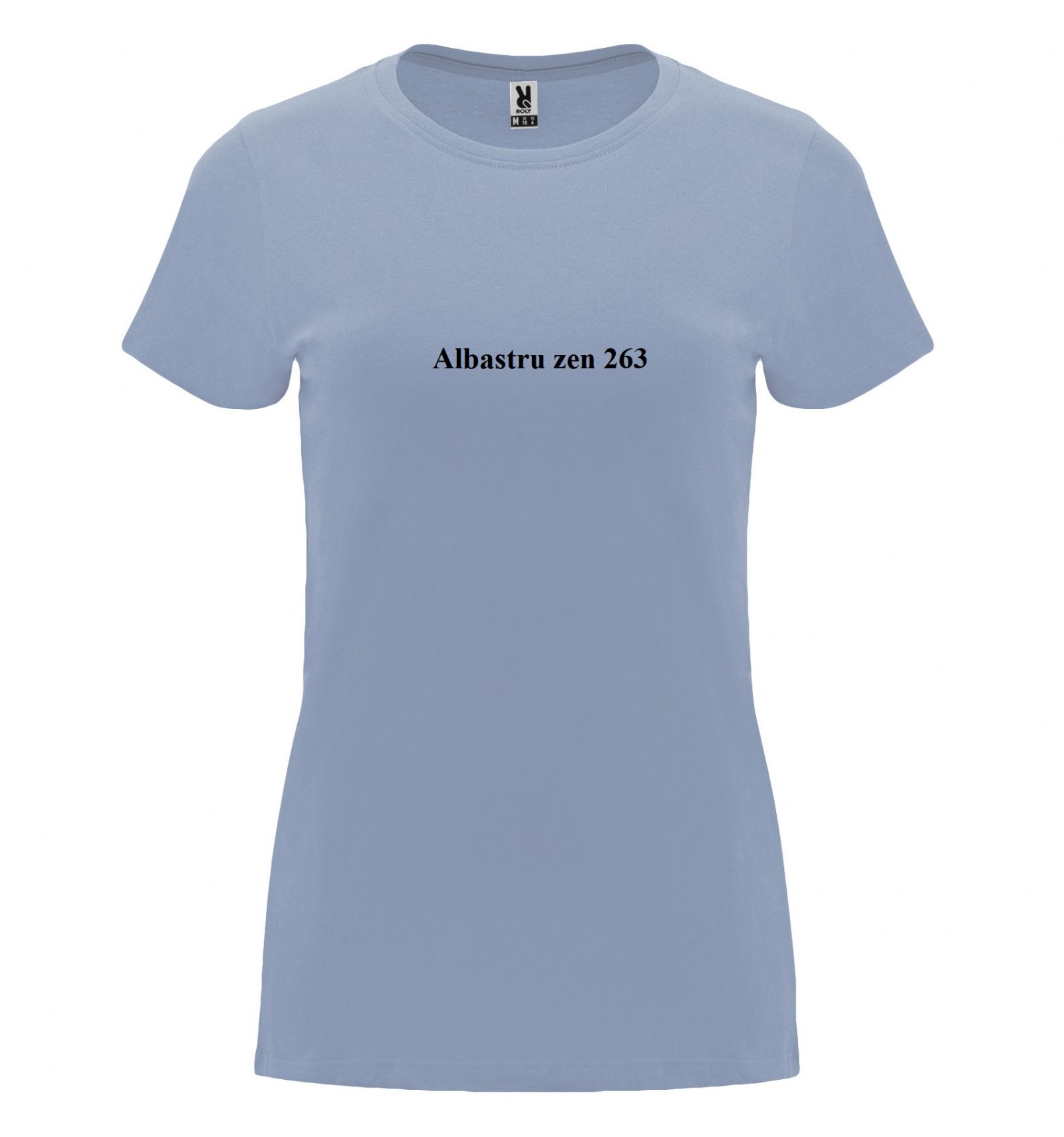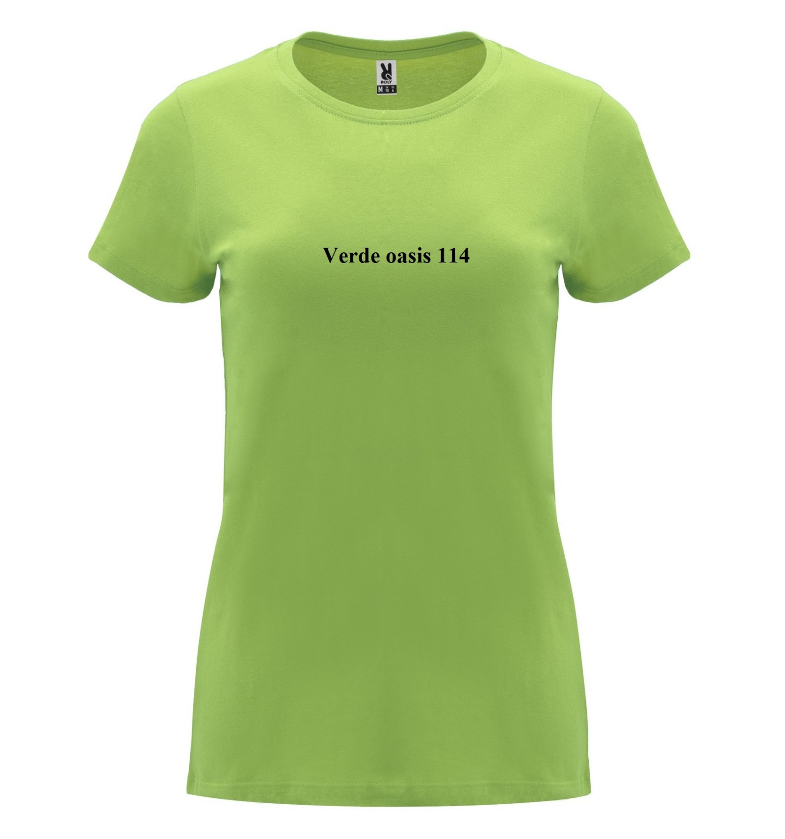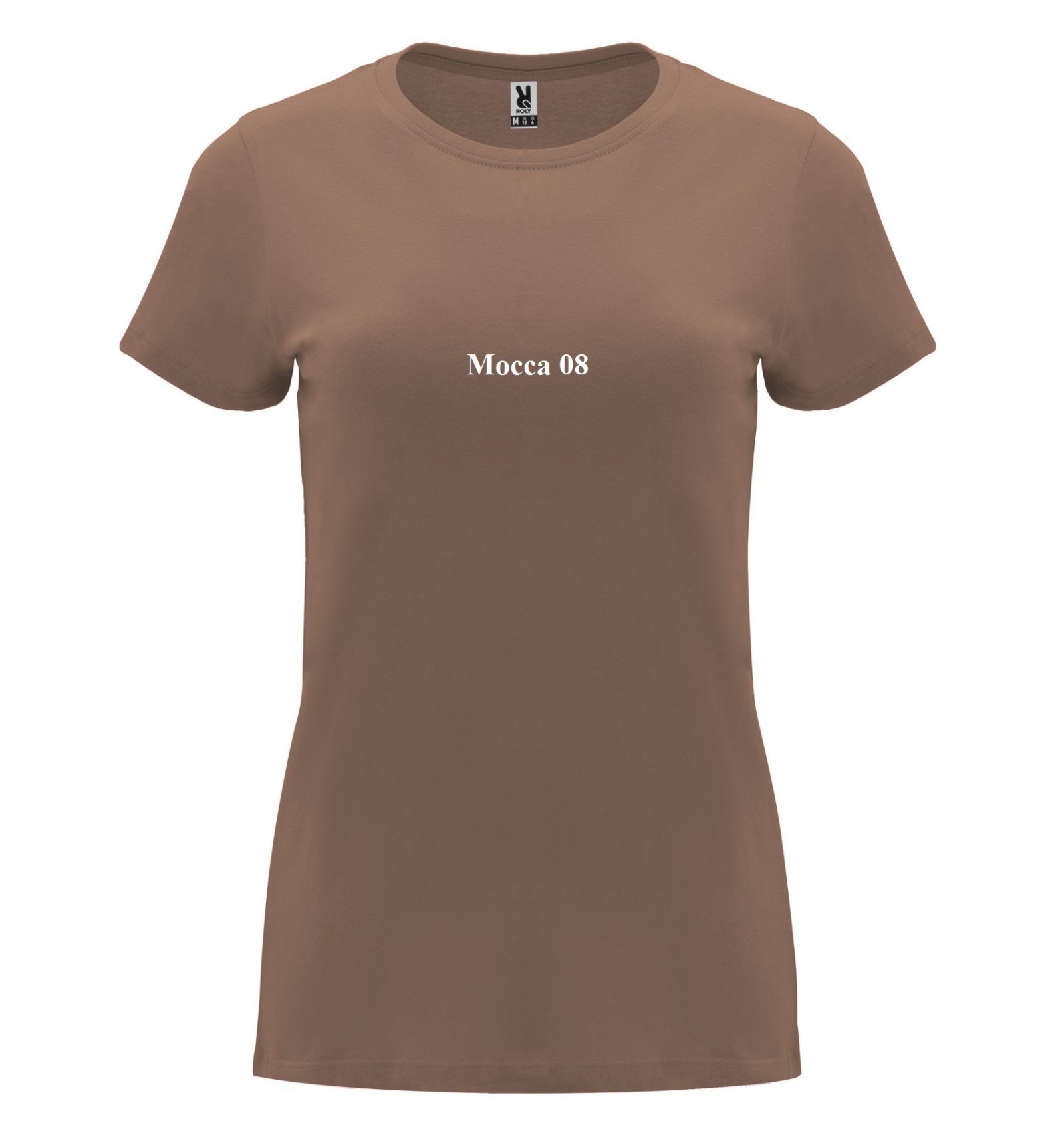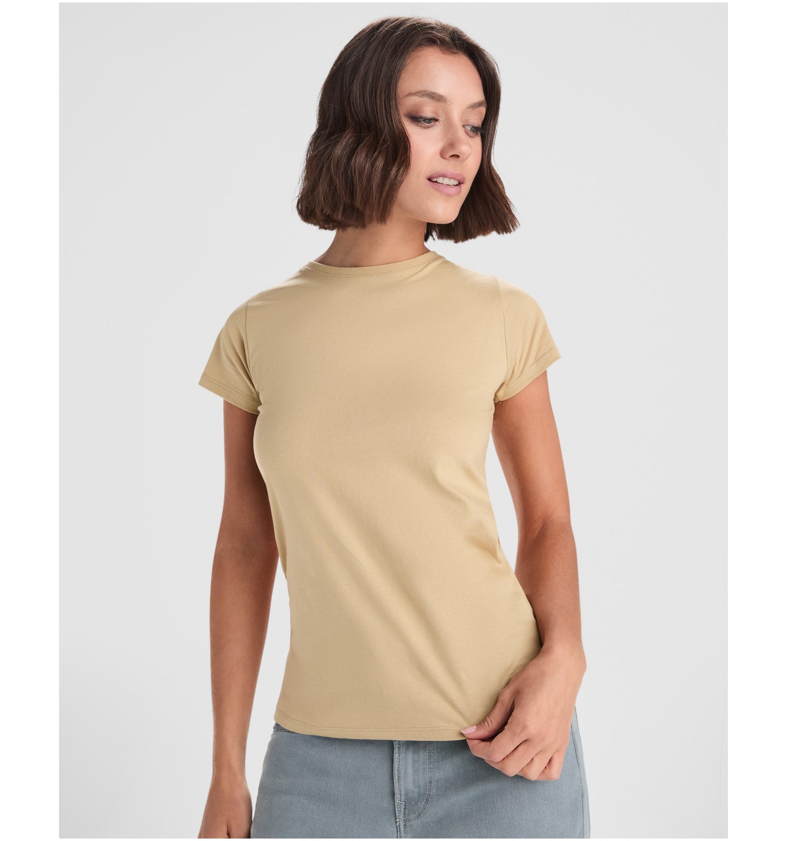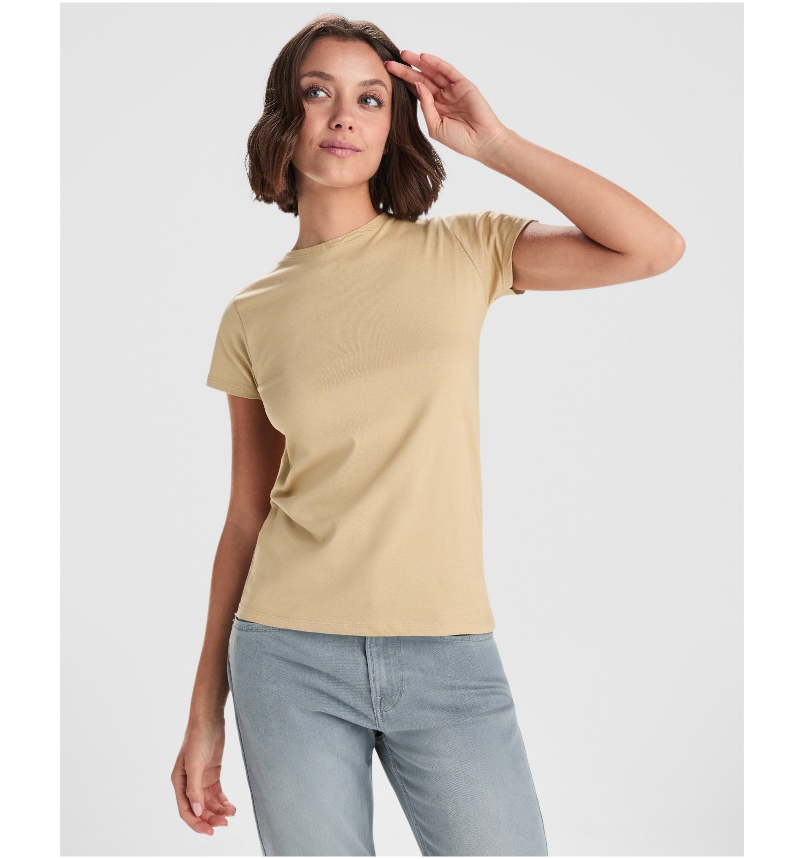 Tricou cu mânecă scurtă de damă. Guler rotund în canalé 1x1. Model cambrat. Bandă întărită pentru acoperirea cusăturilor la guler.