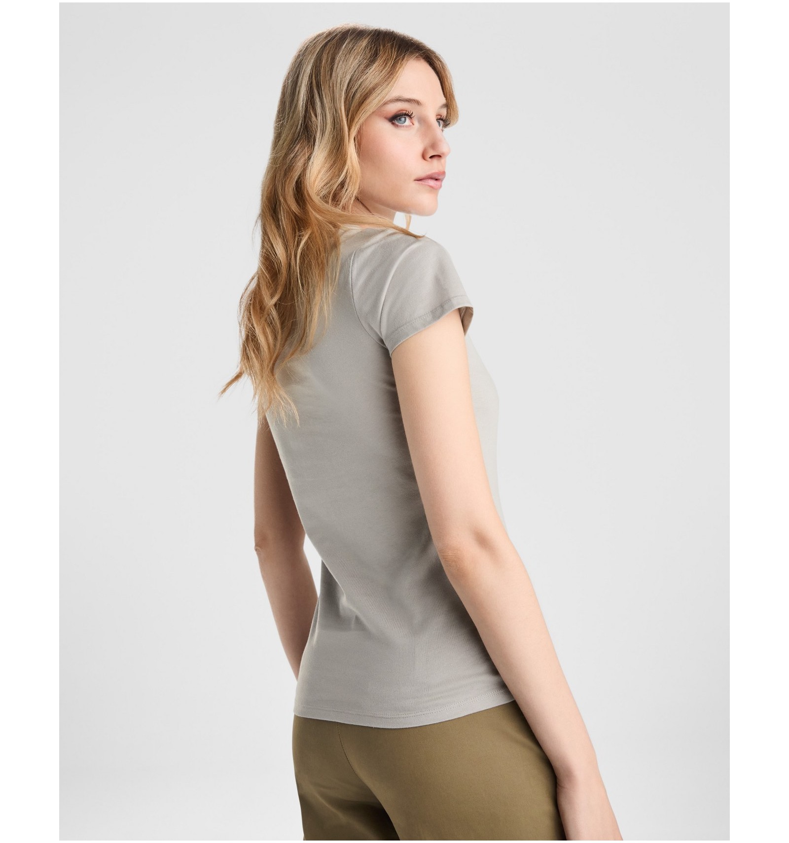 Tricou cambrat cu mânecă scurtă, guler la baza gâtului dublu canelat 1x1, bandă întărită pentru acoperirea cusăturii la guler și umeri, cusături laterale.
