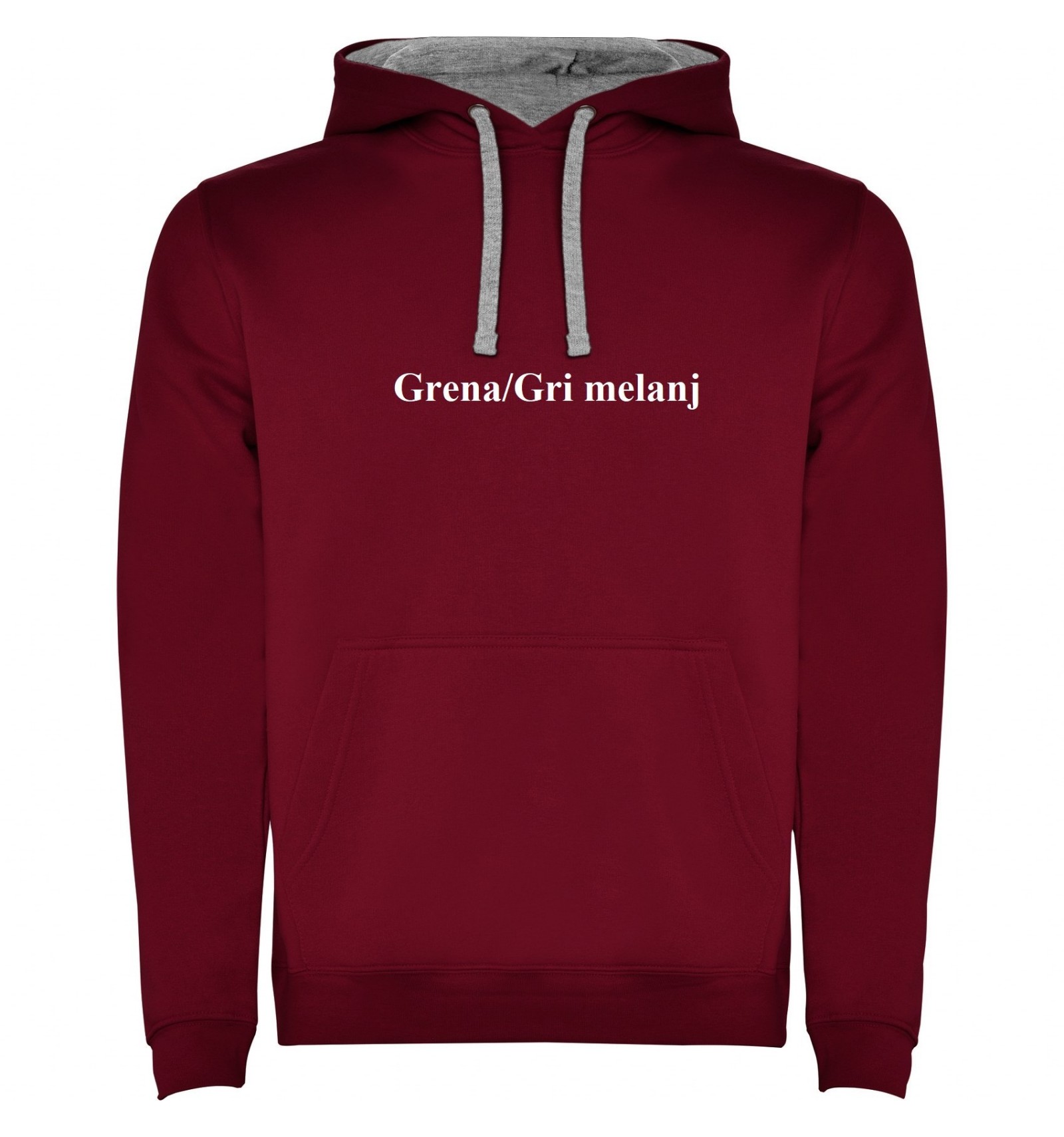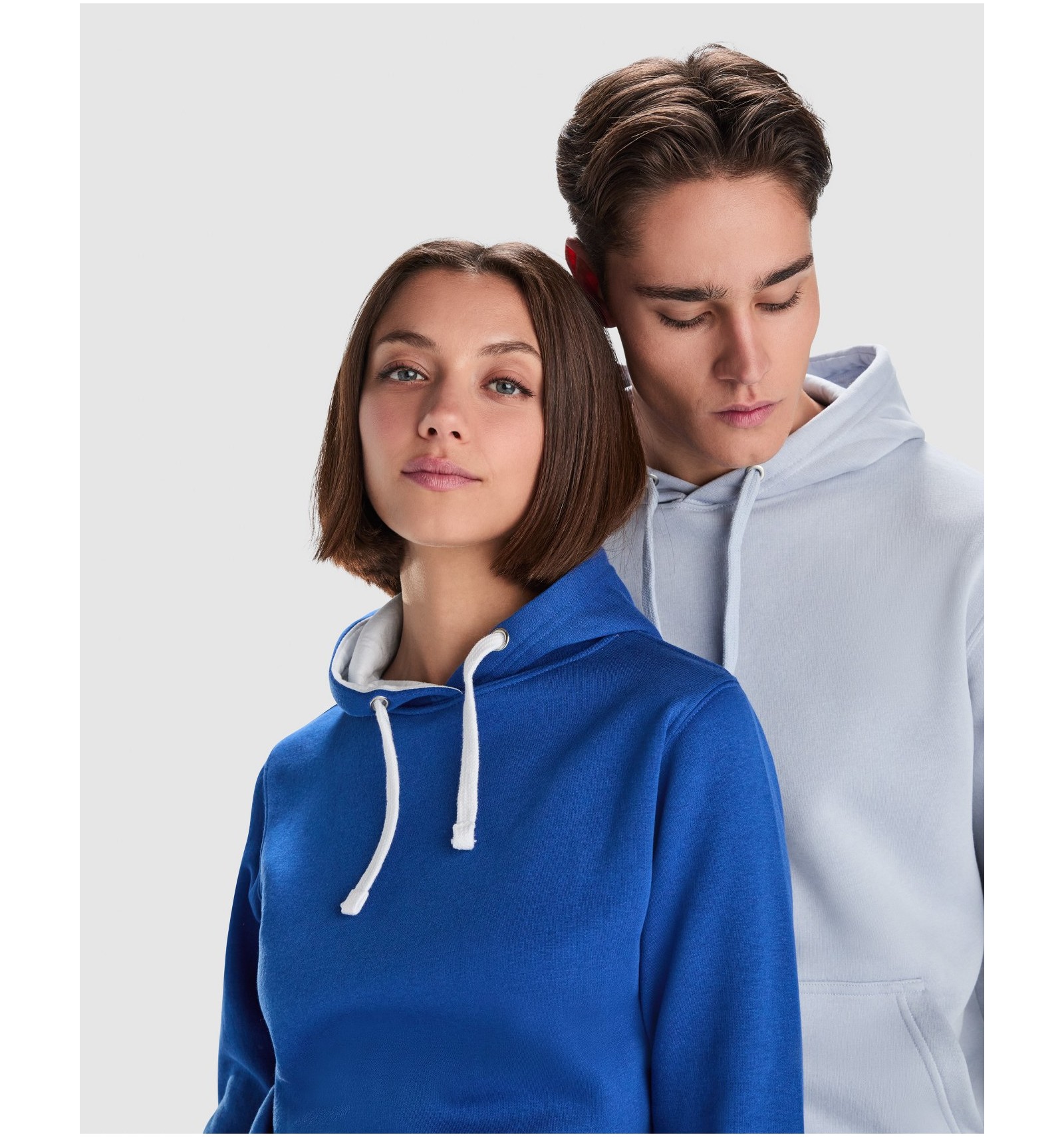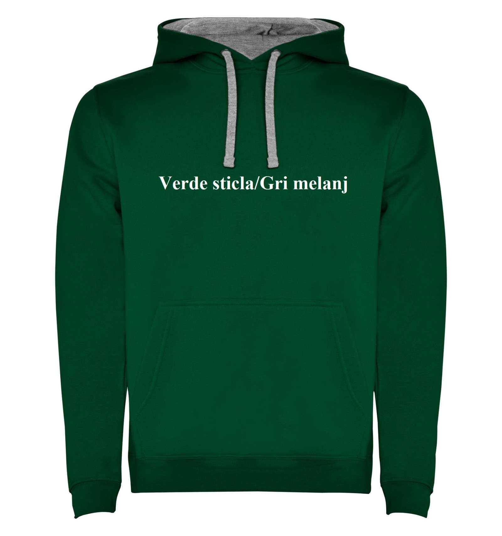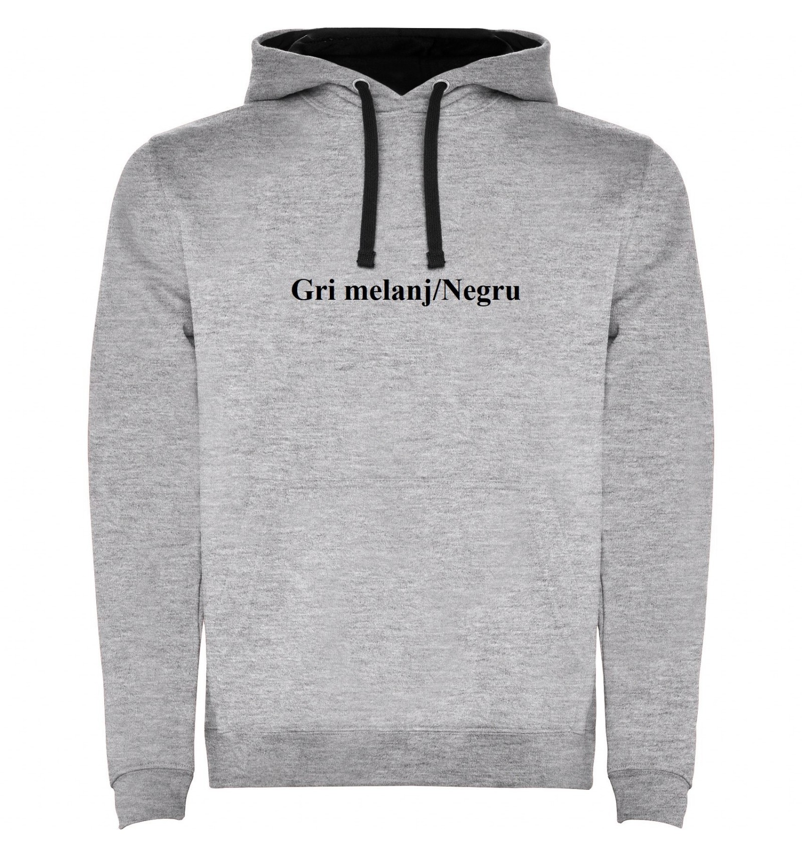 Hanorac cu glugă bicoloră din material dublu, cu șnur în contrast reglabil și buzunar tip marsupiu, cusături acoperite atât la buzunat cât și la guler. Talie și manșete canelate 1x1 cu elastan.