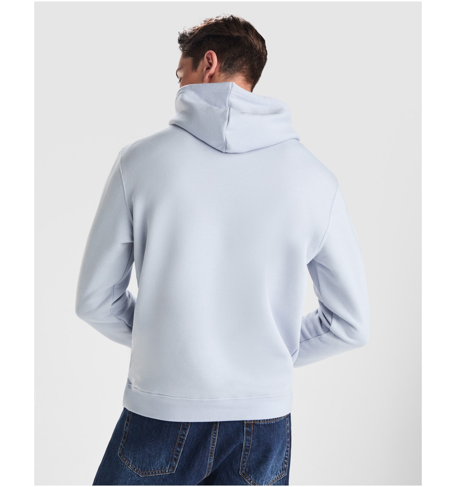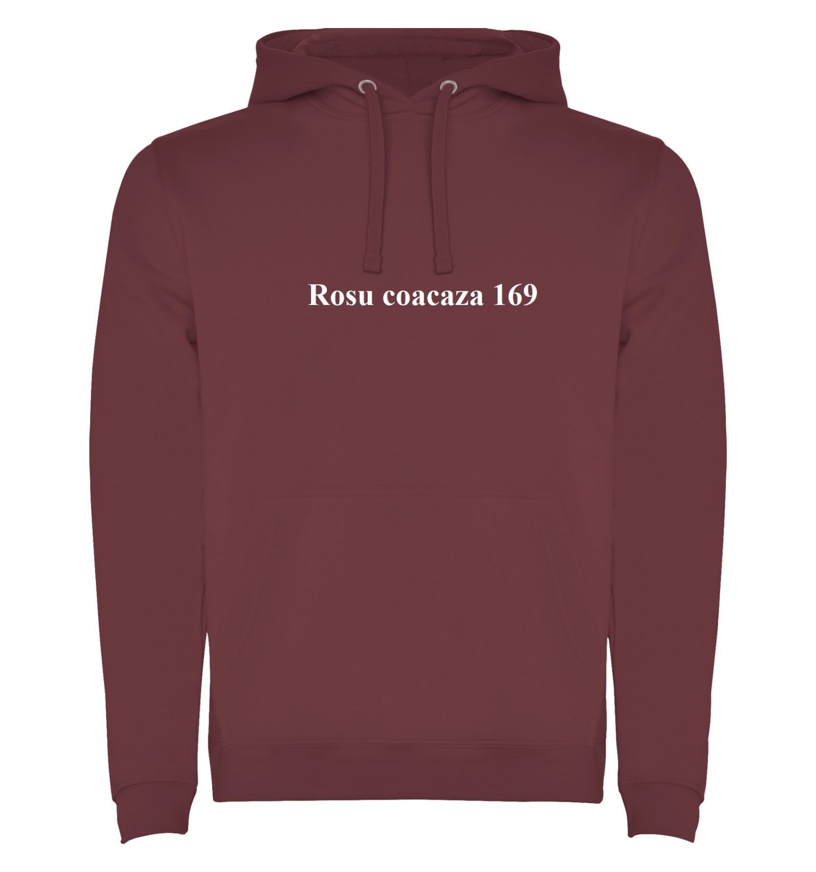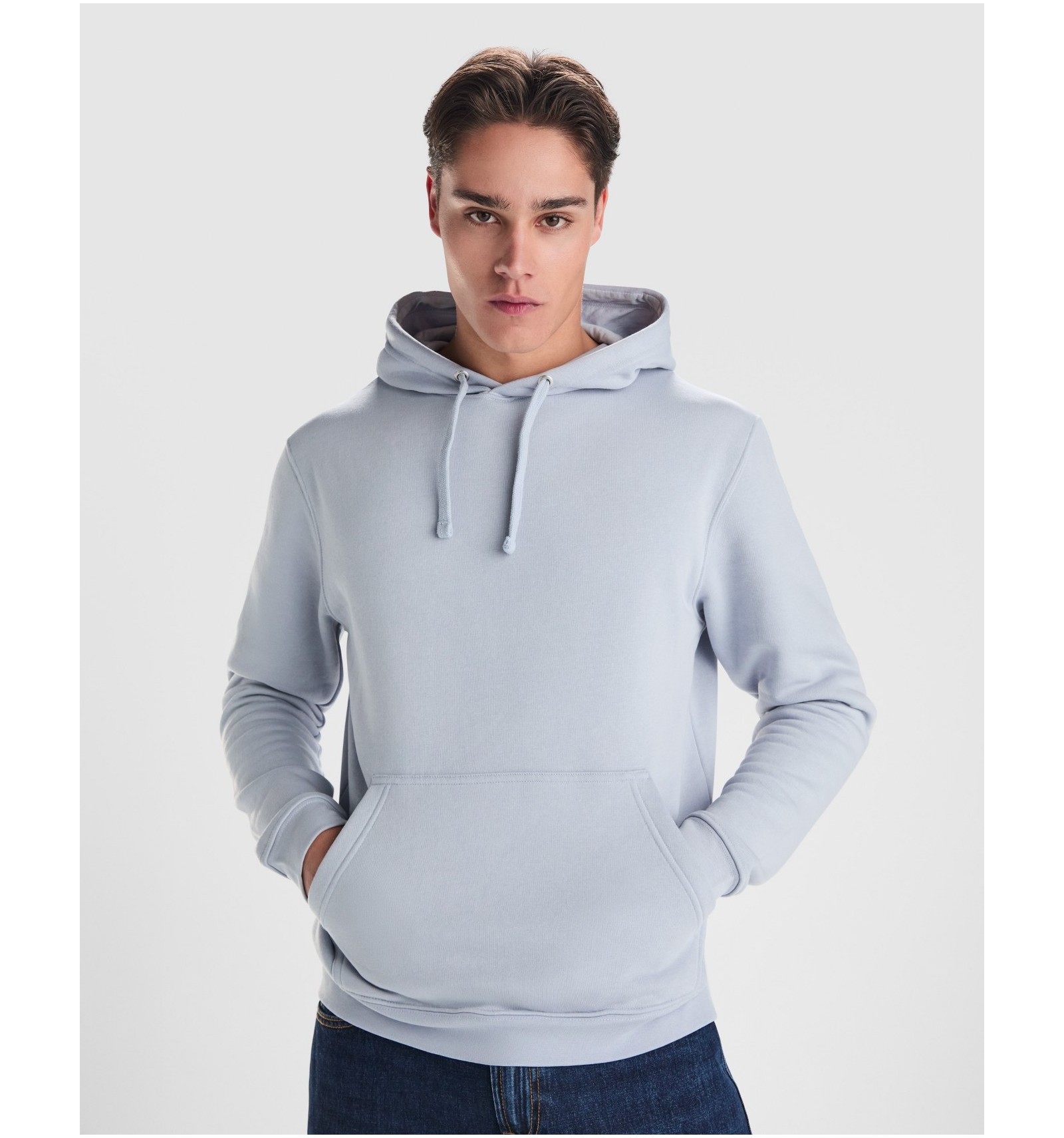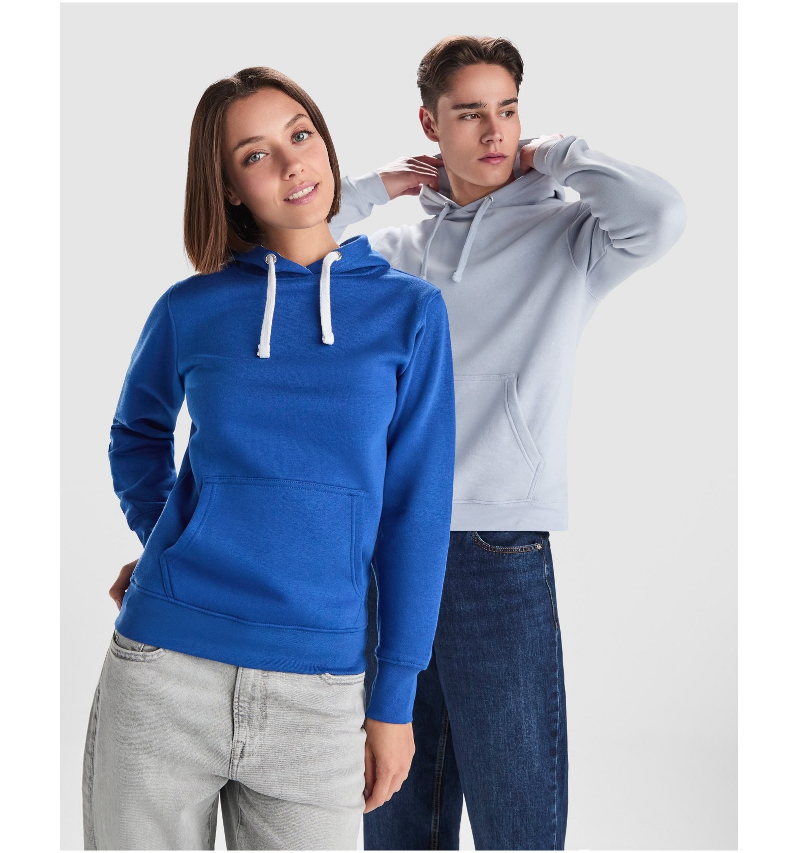 Hanorac cu glugă bicoloră din material dublu, cu șnur în contrast reglabil și buzunar tip marsupiu, cusături acoperite atât la buzunat cât și la guler. Talie și manșete canelate 1x1 cu elastan.