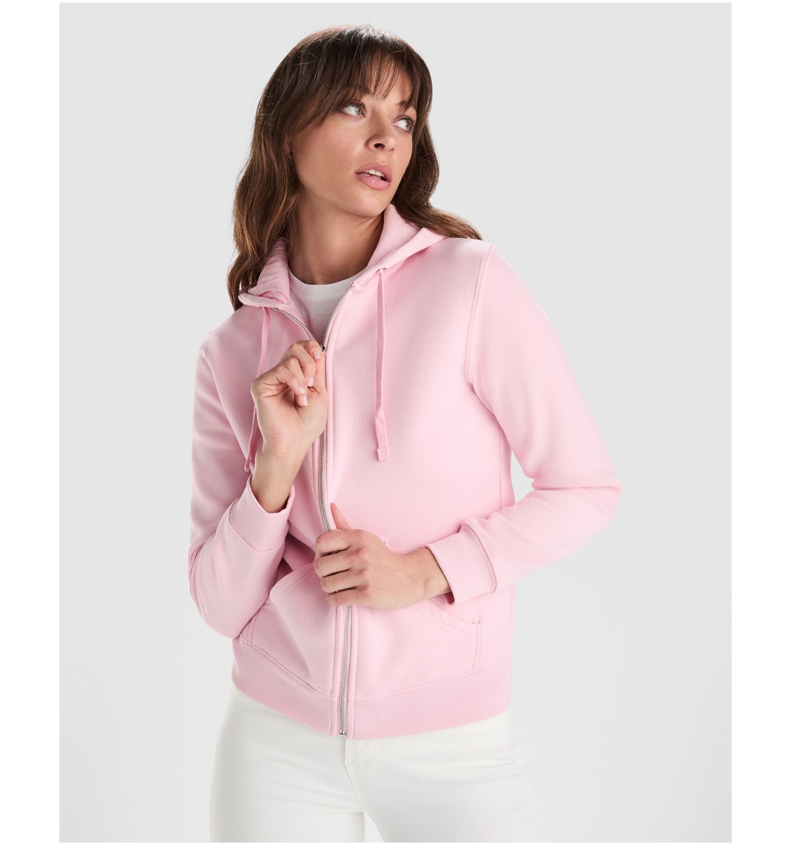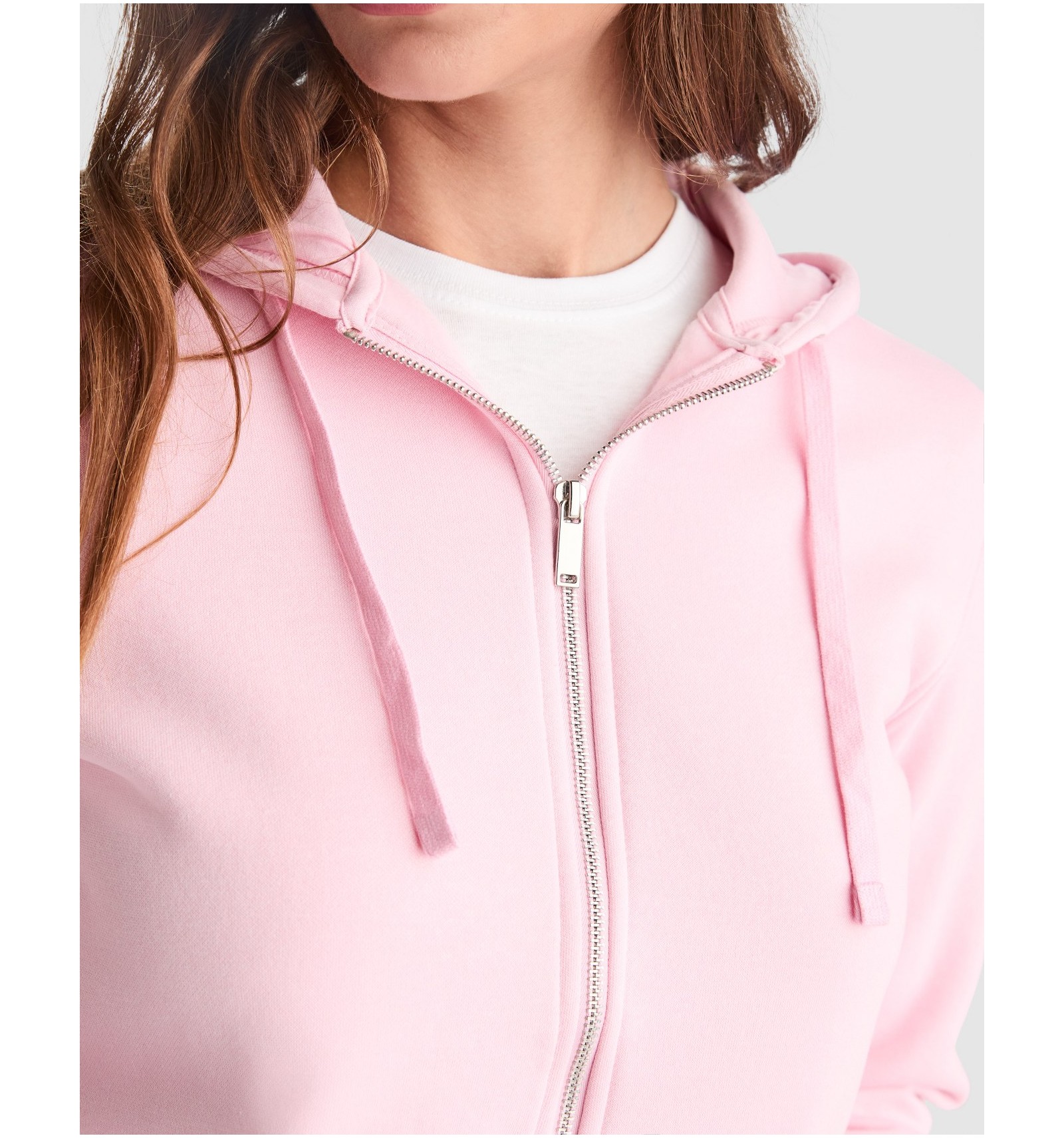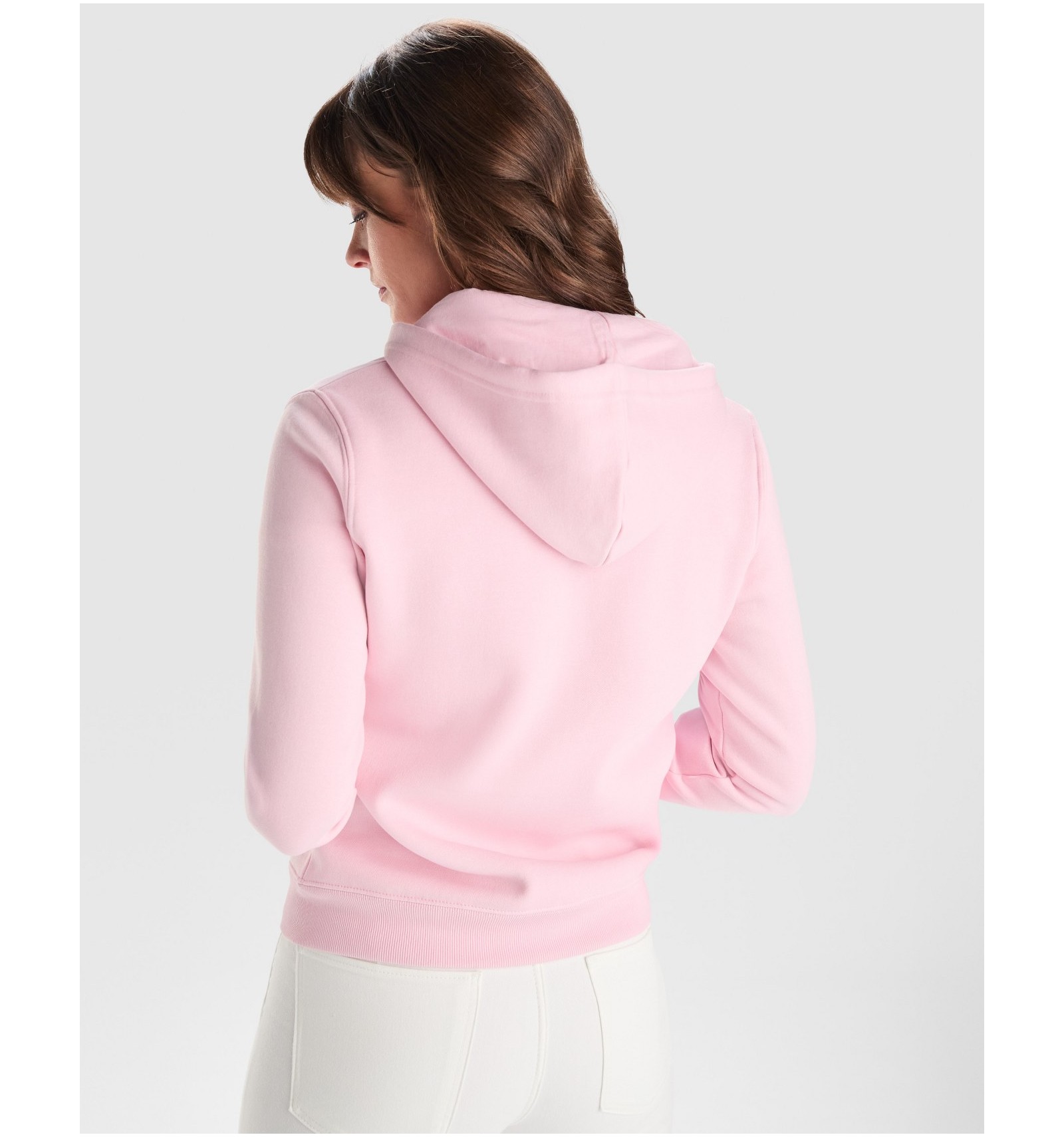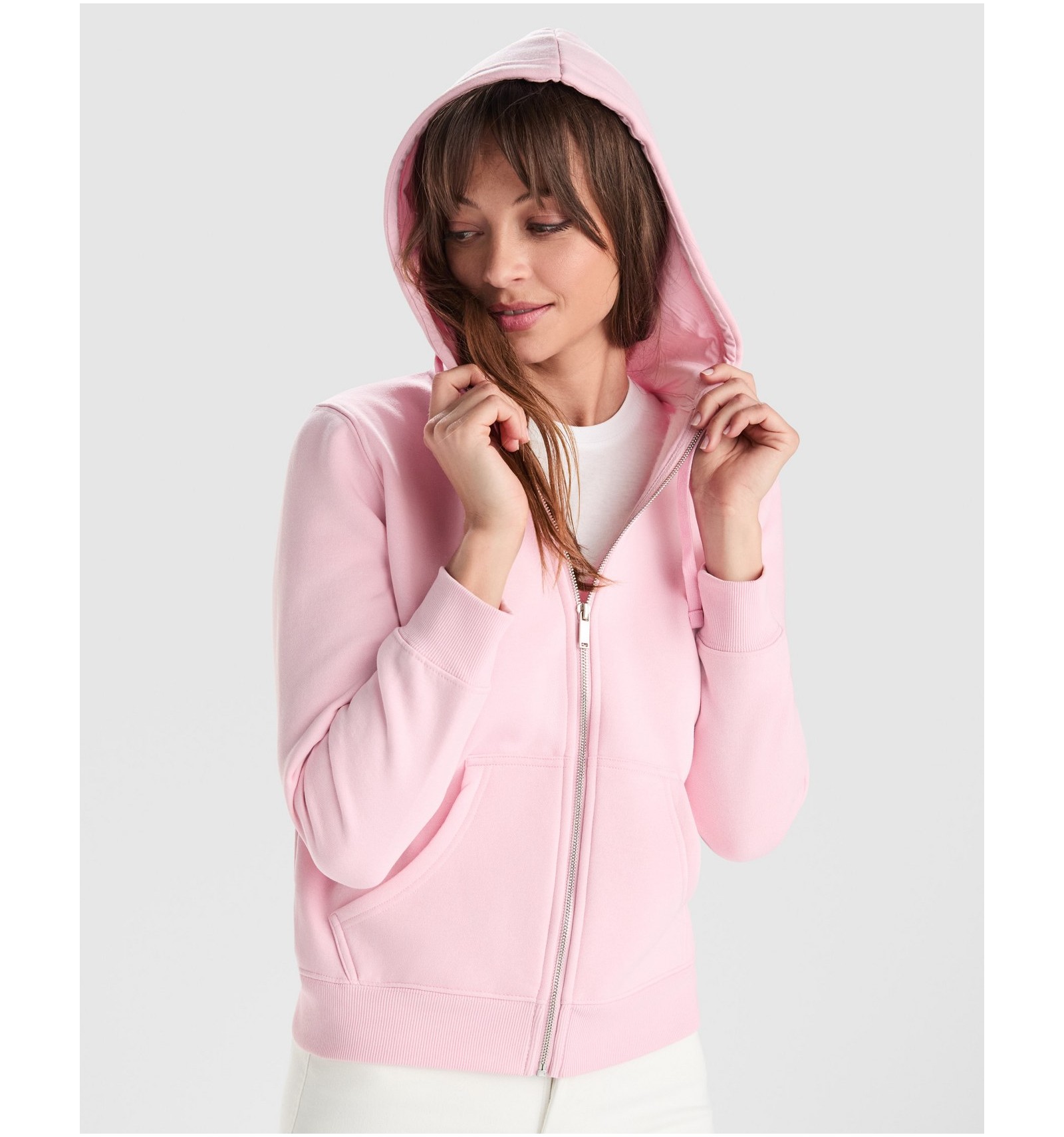 Hanorac de damă cu glugă căptușită. Fermoar metalic în față și buzunar tip marsupiu. Bandă întărită pentru acoperirea cusăturilor la gât. Talie și manșete în punct canalé 2x2. Model cambrat.