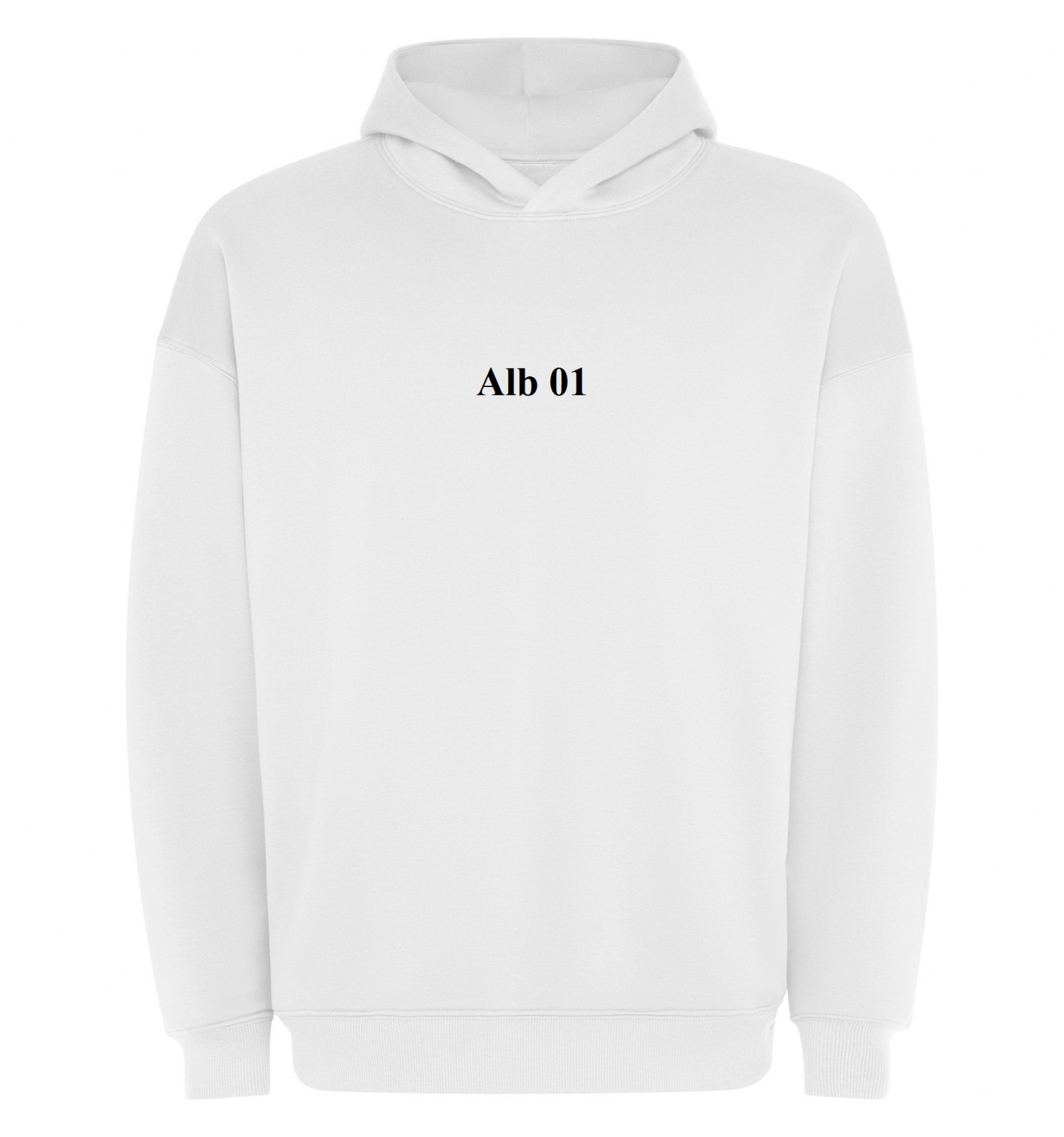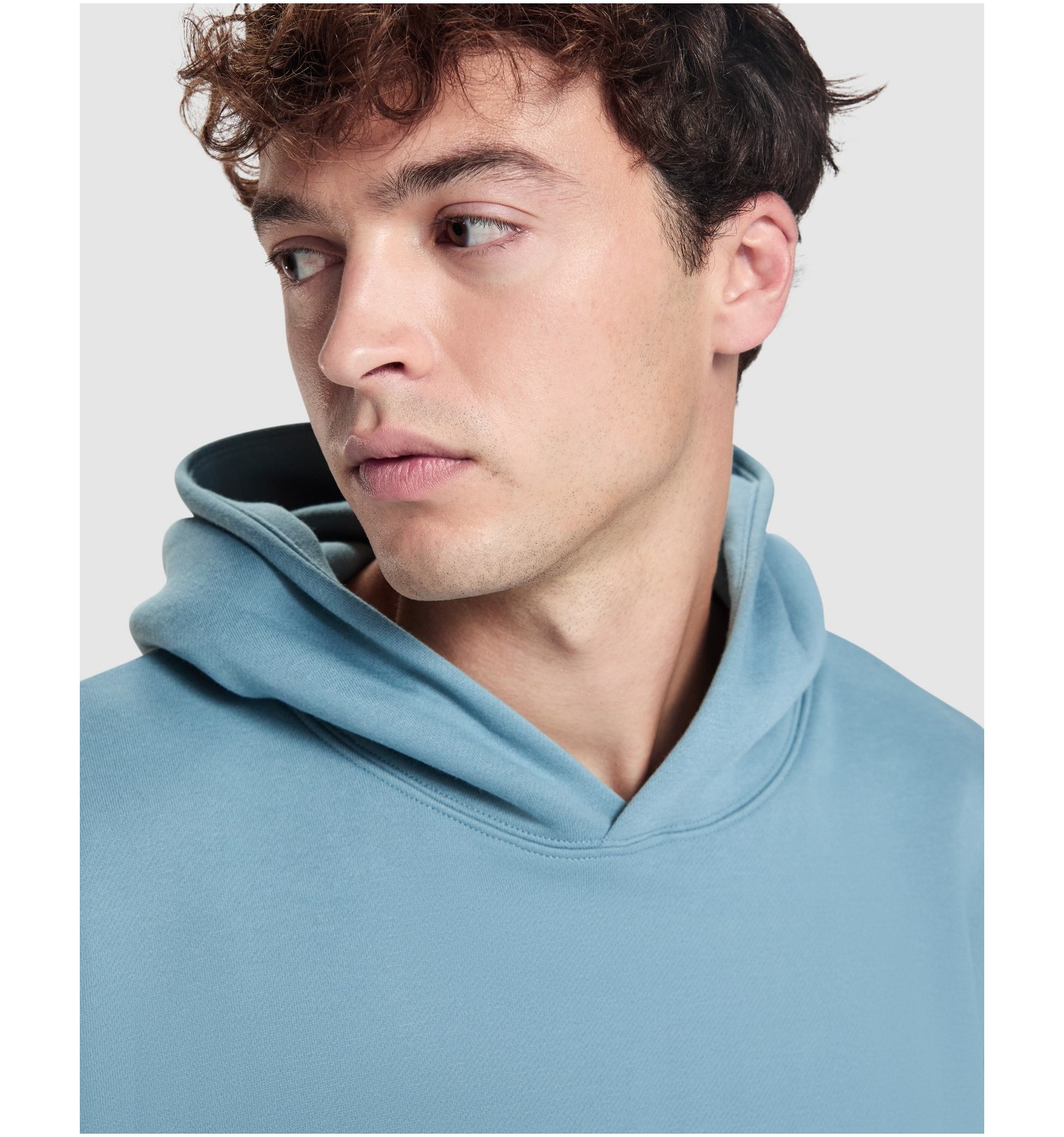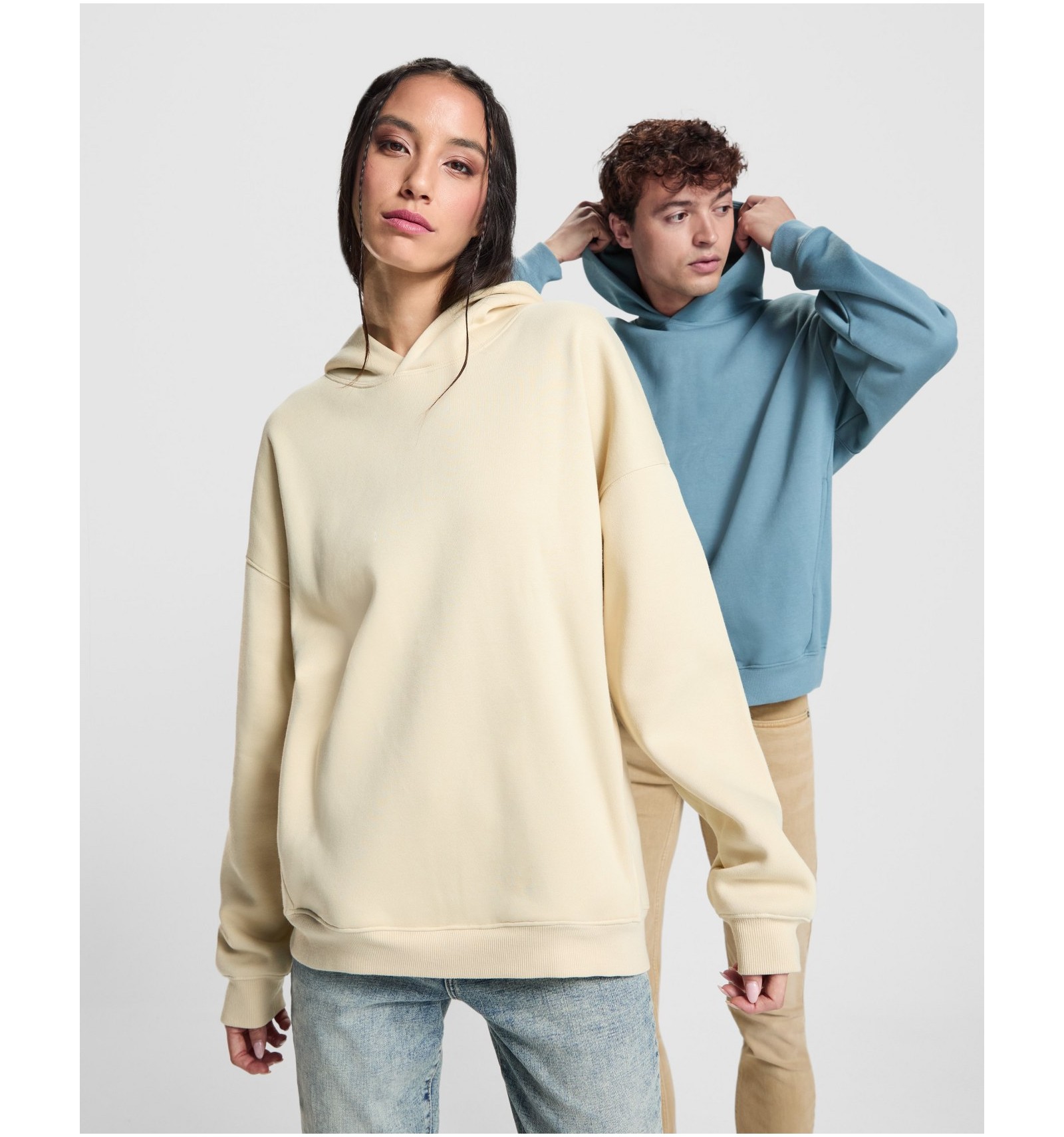 Hanorac unisex oversize, cu glugă căptușită din același material. Guler întărit cu bandă.