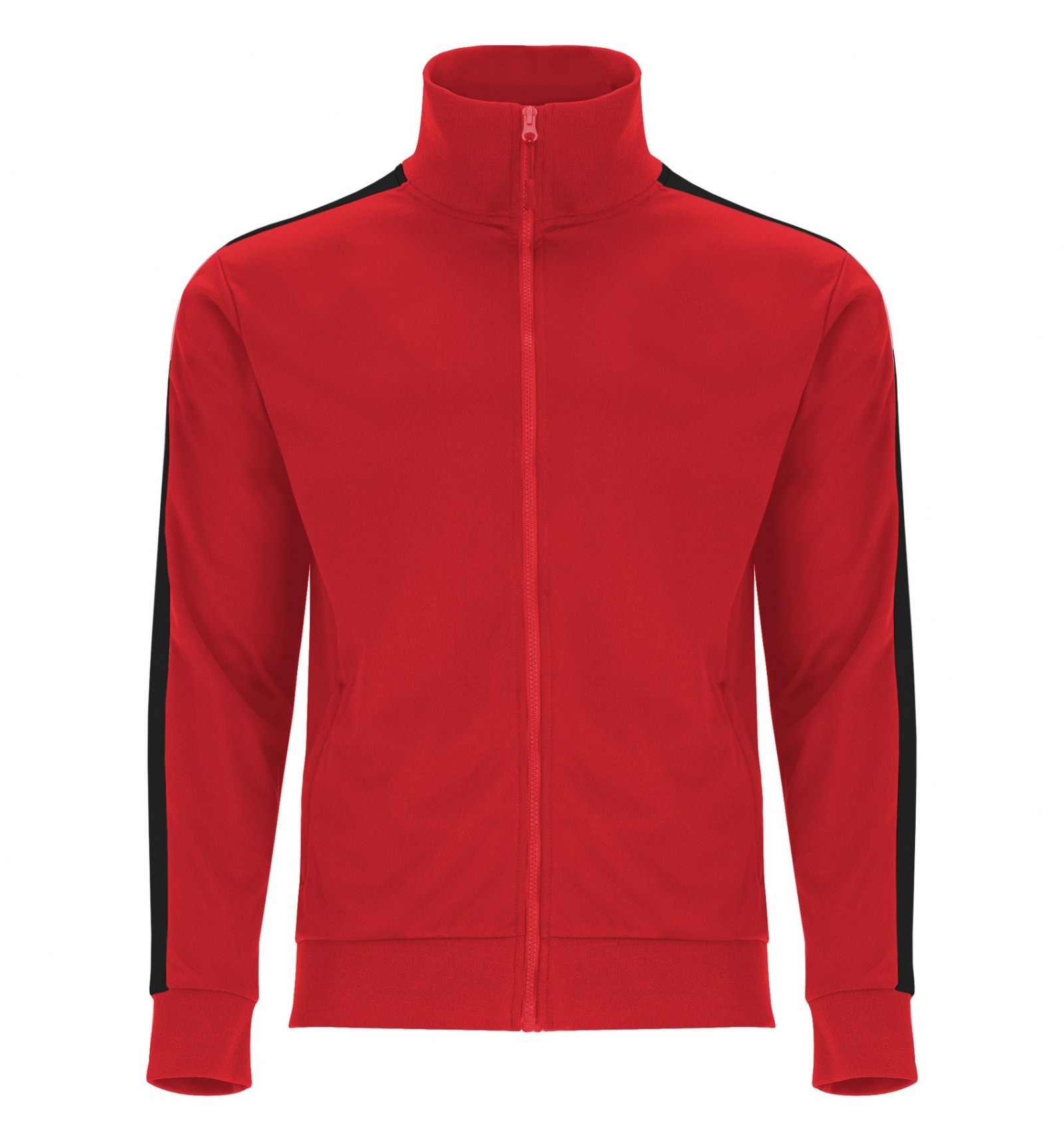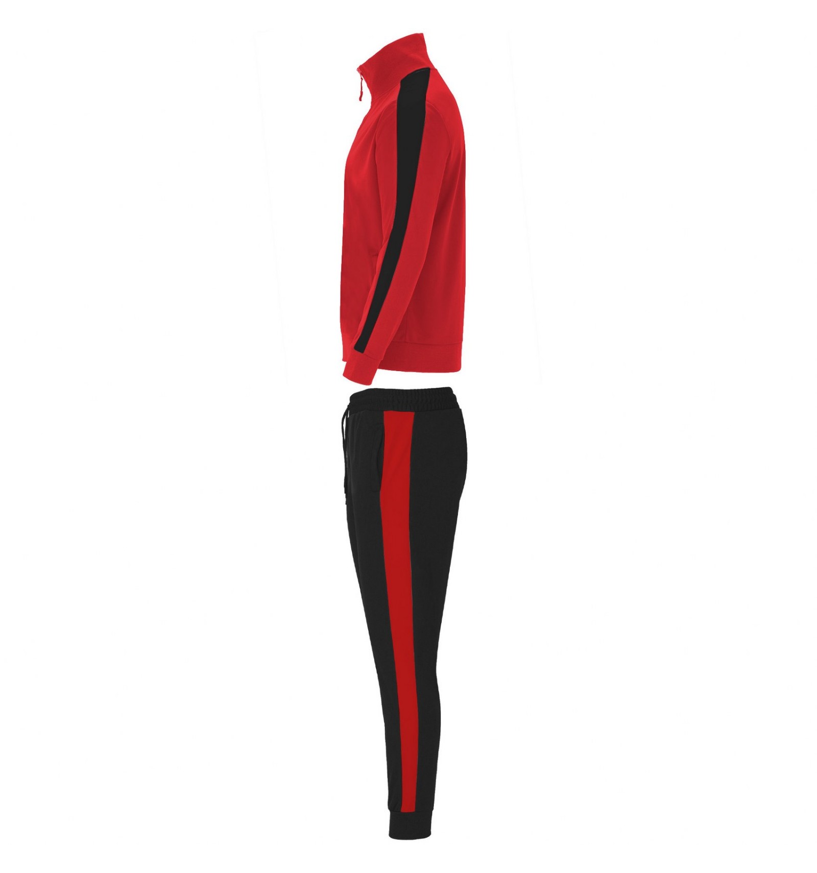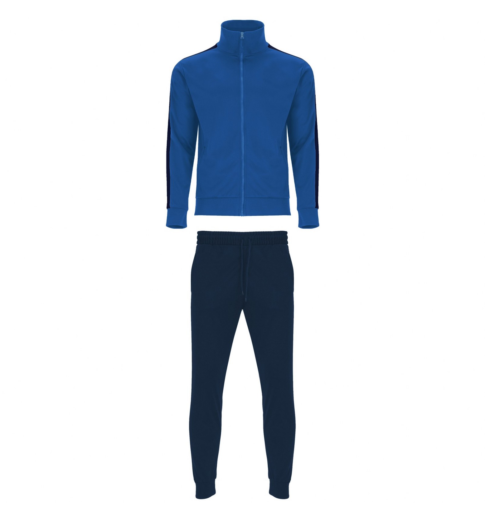 Trening format din două piese, bluză și pantaloni. 1. Guler înalt cu bandă de acoperire a cusăturilor la interior, de aceeași culoare cu gulerul. 2. Guler, manșete și talie în canalé 1x1. 3. Fermoar pe mijloc cu cheiță. 4. Bluză cu buzunare laterale cu fermoar. 5. Bandă laerală în contrast de culoare. 6. Pantaloni cu betelie elastică în talie și șnur reglabil. 7. Două buzunare laterale. 8. Buzunar la spate cu fermoar. 9. Pantaloni cu manșetă elastică în canalé 1x1.