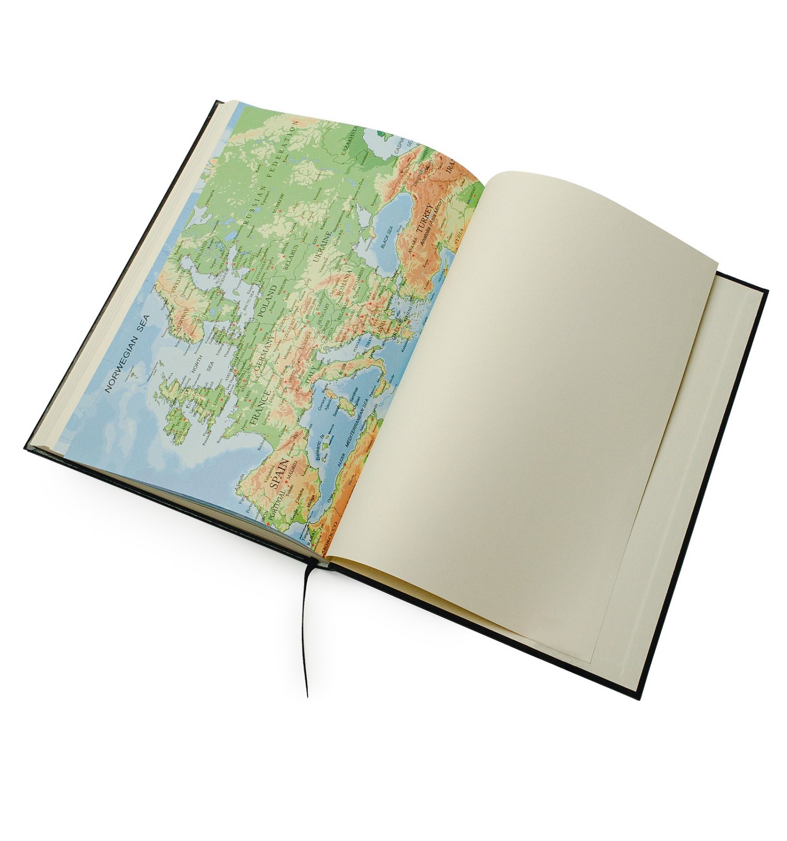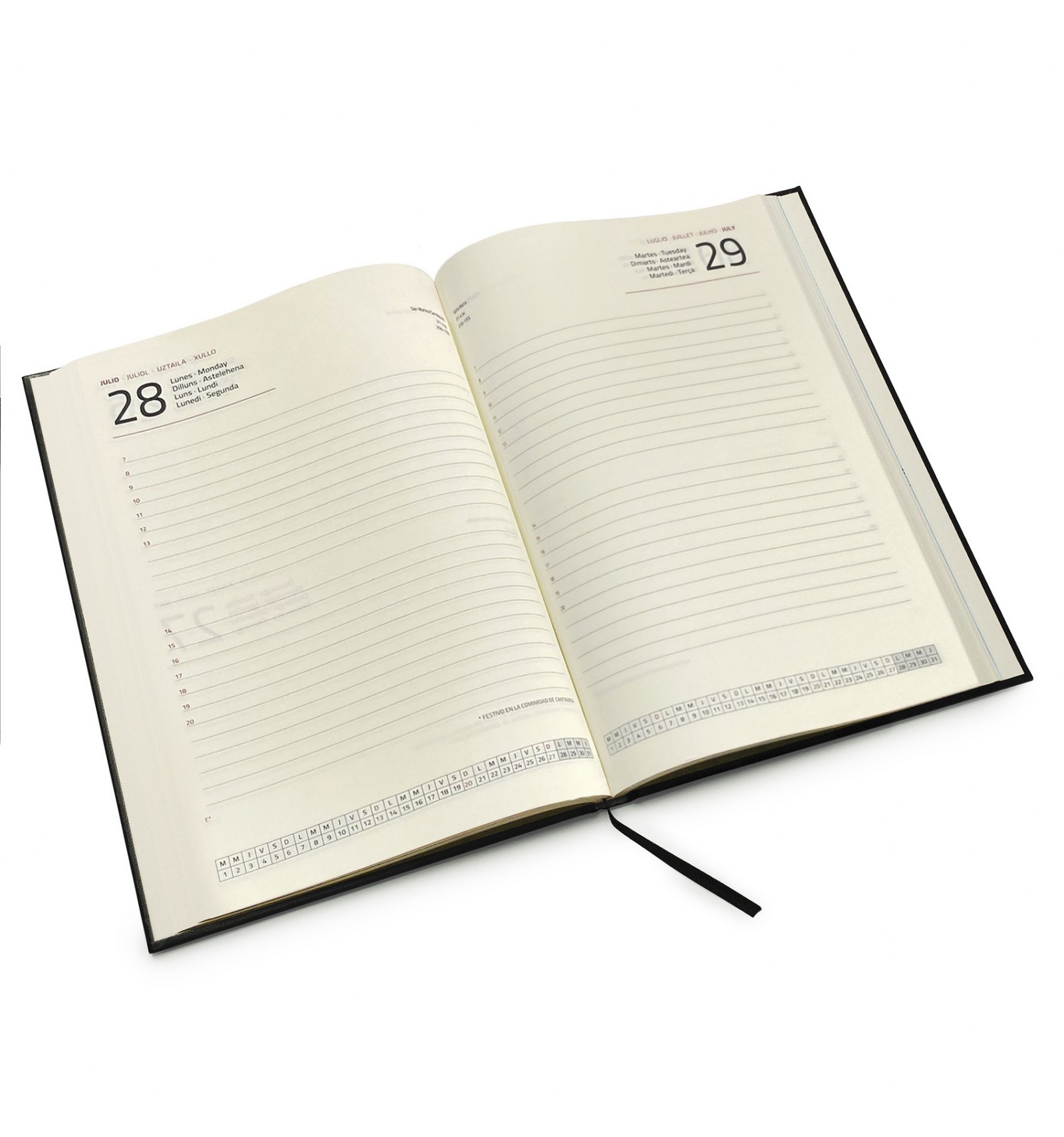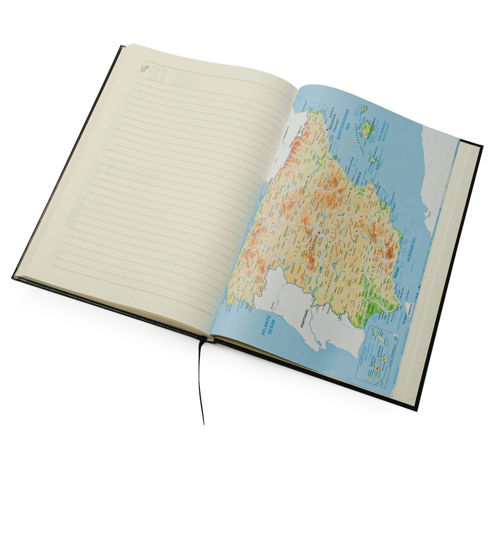 Agendă cu copertă căptușită din PU cu gravură în relief. 320 pagini bej plus 4 pagini cu hărți. Semn de carte de aceeași culoare ca și coperta. Prezentare în cutie albă individuală.