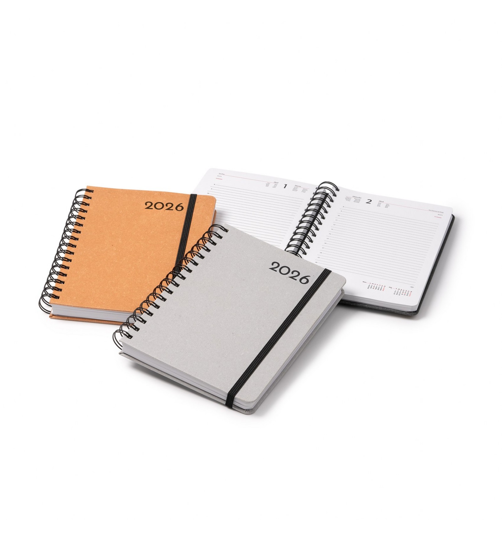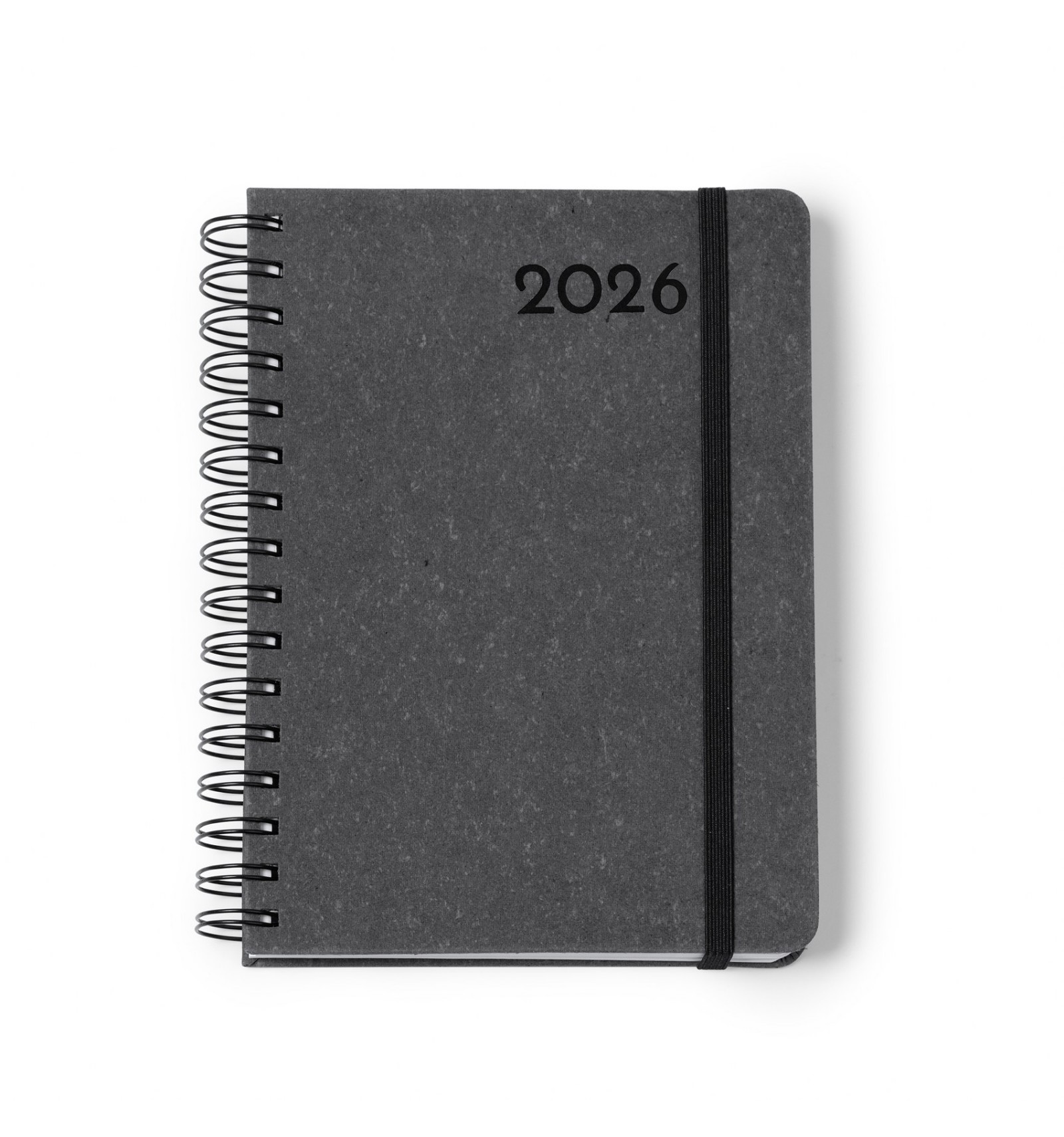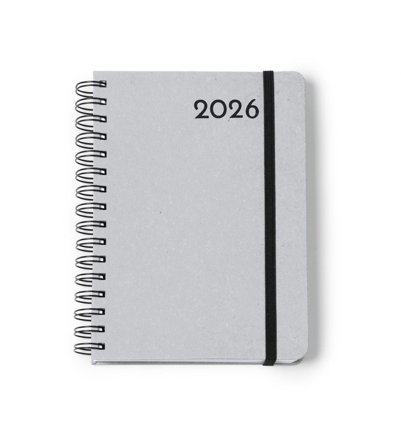 Agenda A5 cu spirala si coperți din piele reciclată. Anul embosat în relief redus și bandă elastică. Dispune de 348 de pagini de hârtie albă și 4 pagini suplimentare cu hărți. Ideal pentru a vă păstra notițele organizate cu stil și durabilitate.