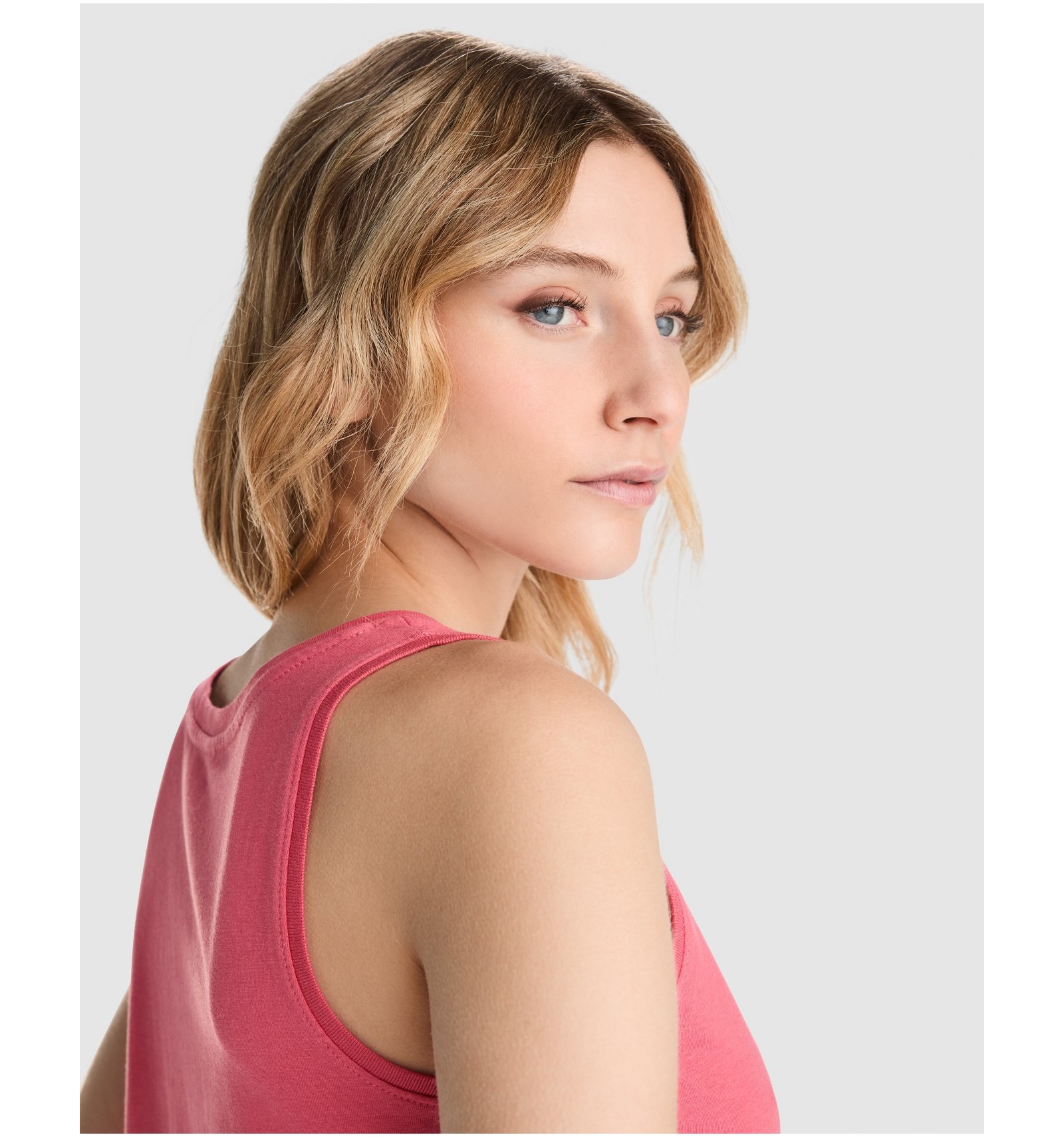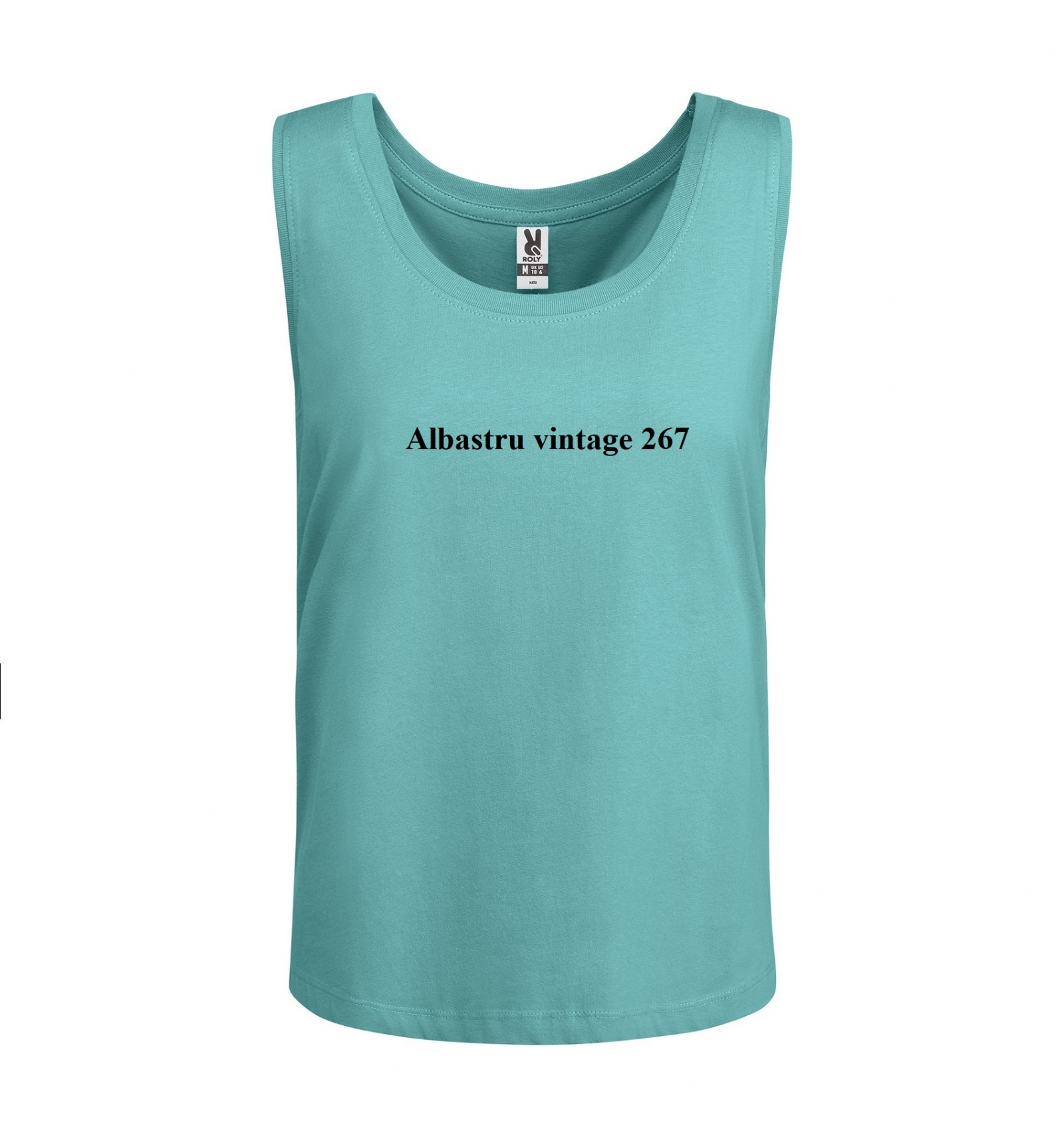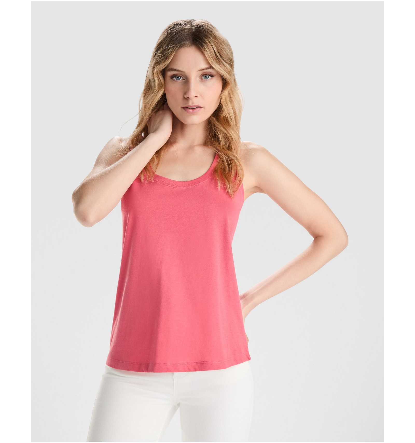 Tricou larg pentru femei cu bretele largi. 1x1 decolteu și mâneci cu striații. Tiv rotund. Cusături laterale.