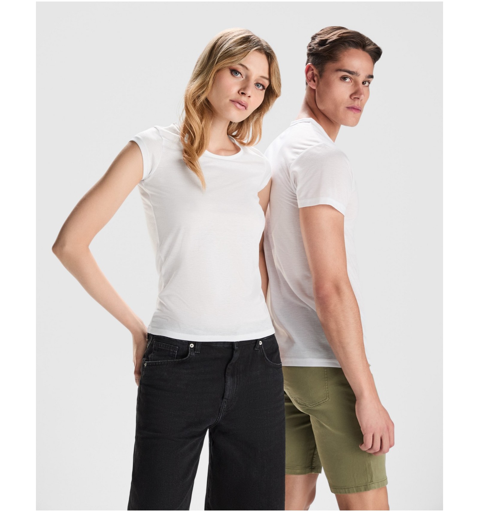 Tricou cambrat cu mânecă scurtă și guler rotund cu garnitură din același material. Are cusături laterale. Fabricat din poliester însă de tact bumbac