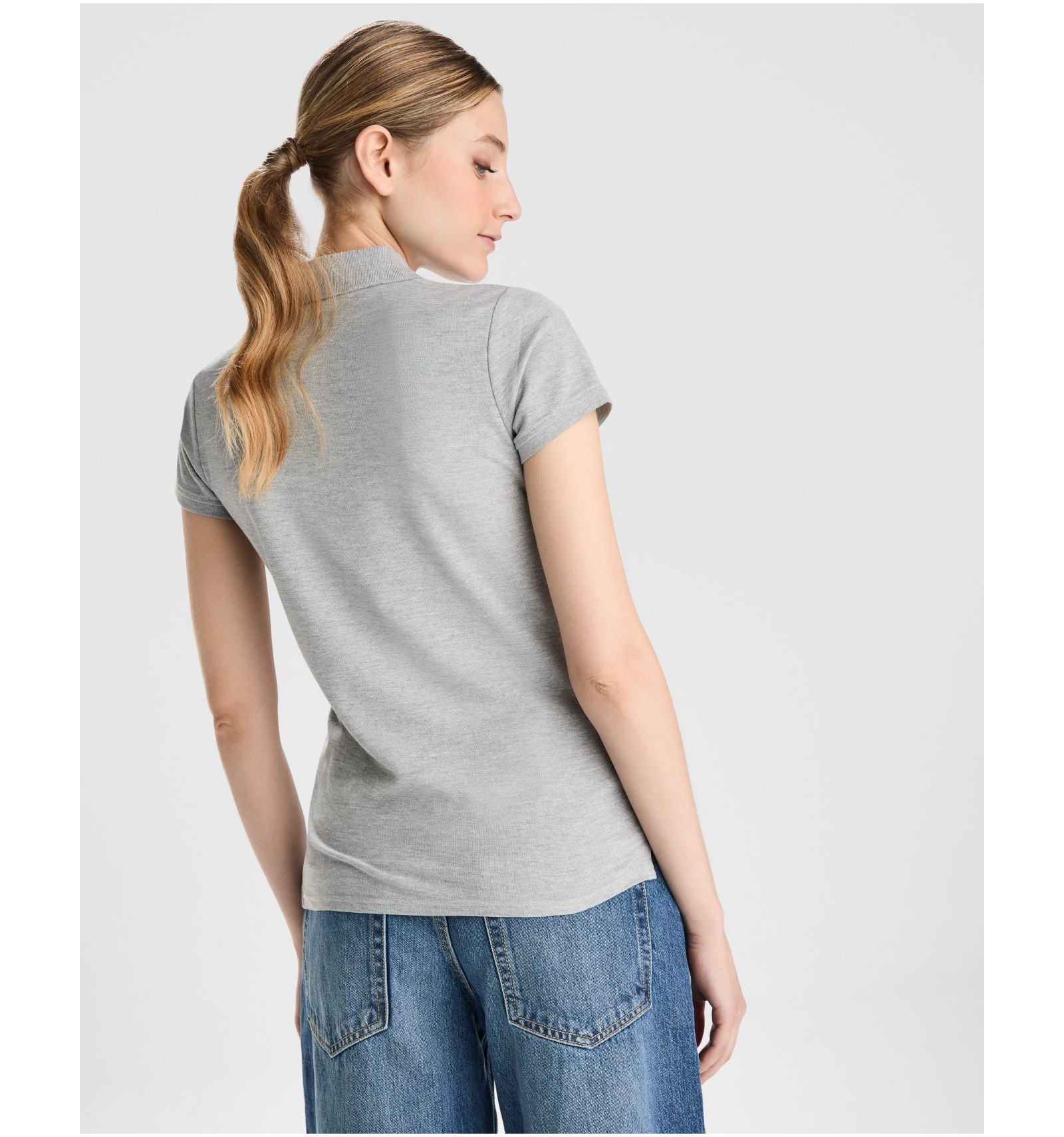 Tricou polo cambrată cu mânecă scurtă din bumbac ecologic certificat OCS pentru femei. 1x1 guler și manșete cu striații. Buzunar cu 2 nasturi. Cusături acoperite întărite la guler. Fante laterale pe tiv.